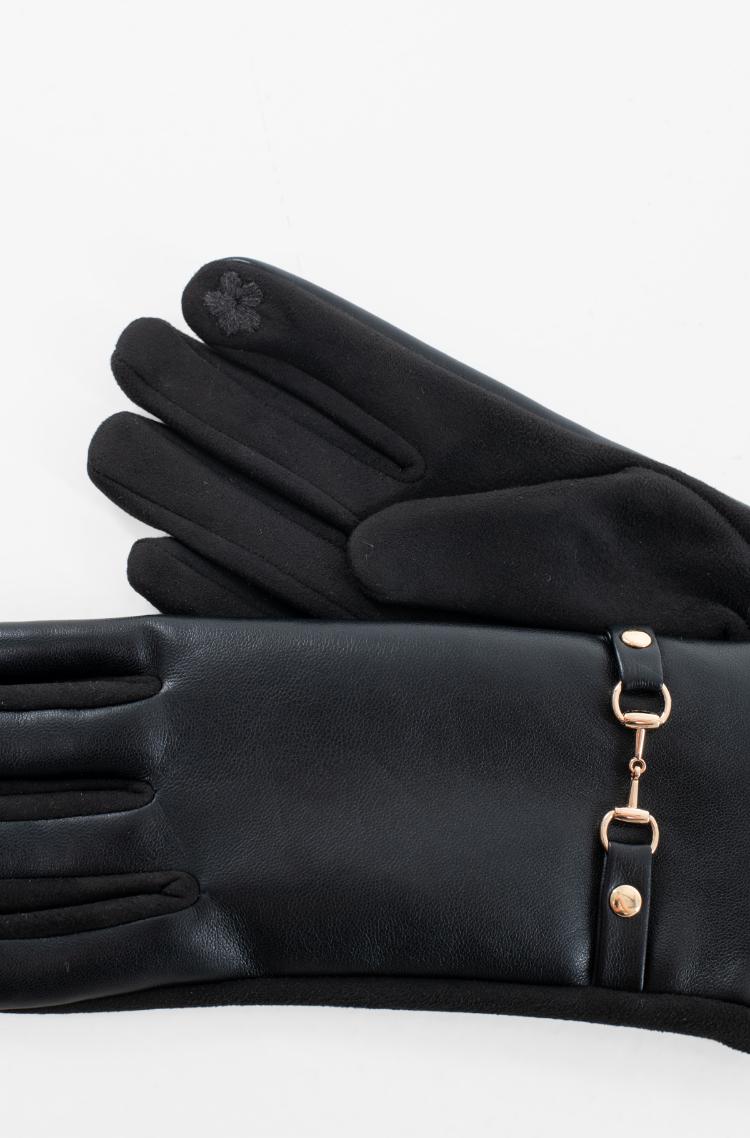 Czarne rękawiczki z ecoskóry połączonej z tkaniną. Rękawiczka do ekranów dotykowych, posiada specjalny dotykowy punkt na palcu wskazującym, umożliwiający korzystanie z ekranów dotykowych bez zdejmowania rękawiczki.