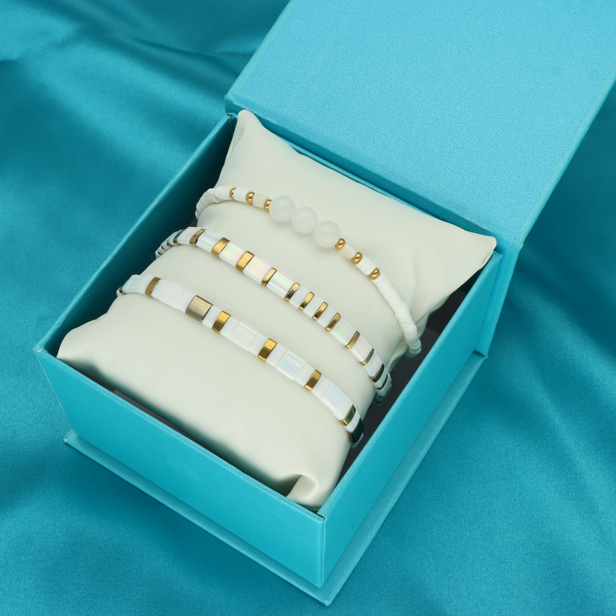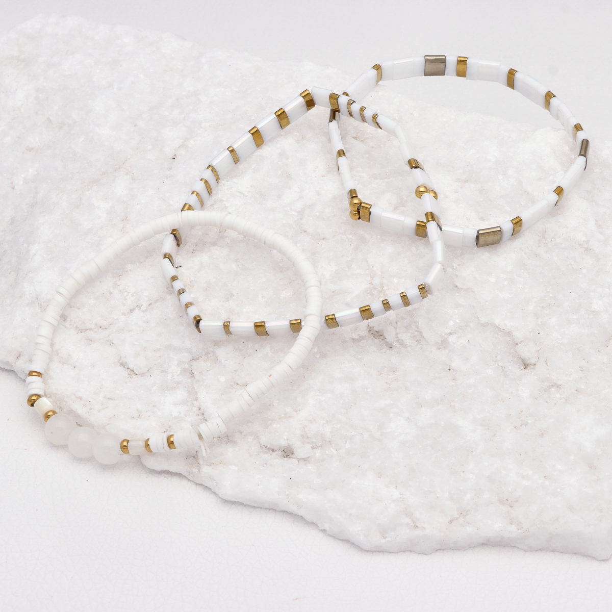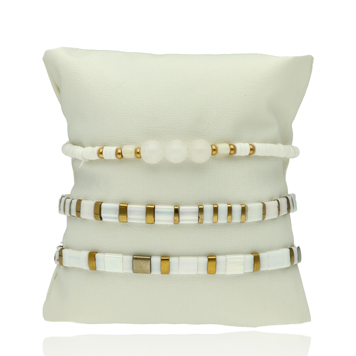 Zestaw bransoletek wykonanych z wysokiej jakości materiałów. Biżuteria antyalergiczna: stal szlachetna pozłacana, koraliki TILA & FIMO, jadeit biały. Zapakowane w eleganckie pudełko z poduszeczką. Czas wysyłki 1-2 dni.