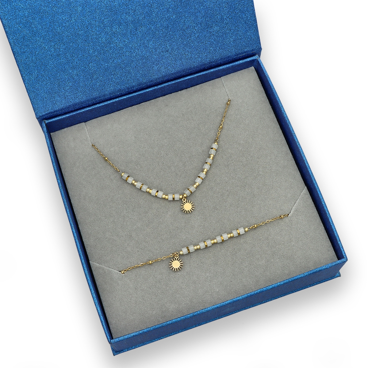 Zestaw ekskluzywnej bizuterii: naszyjnik i bransoletka w eleganckim pudełeczku. Biżuteria antyalergiczna: stal szlachetna 316L pozłacana 16K złotem. Jadeit biały.