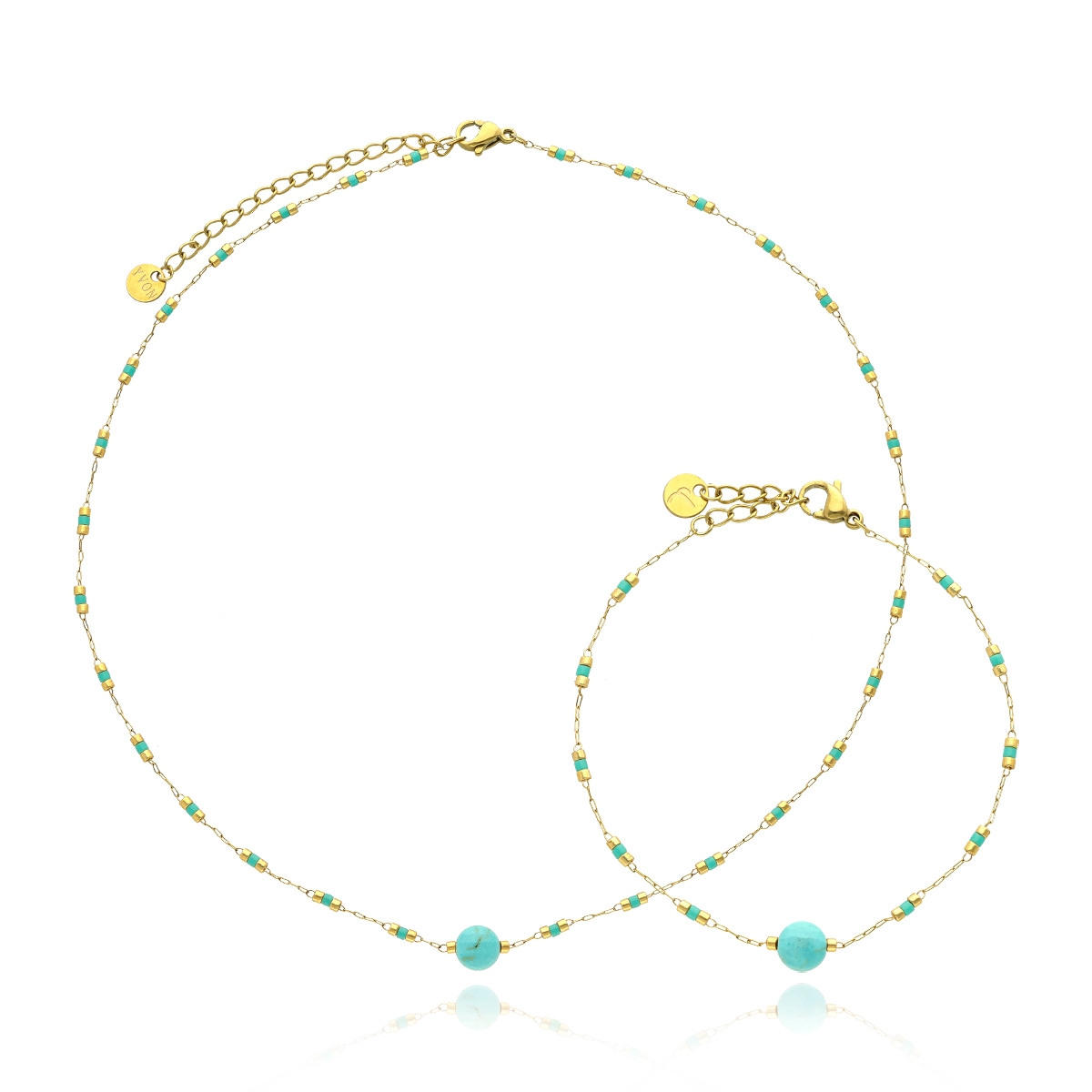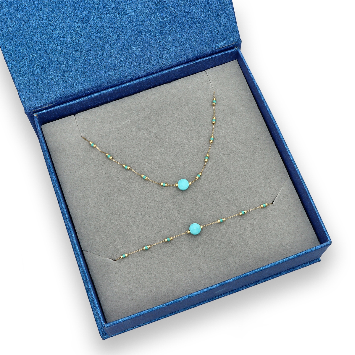 Zestaw ekskluzywnej biżuterii: naszyjnik i bransoletka w eleganckim pudełeczku. Biżuteria antyalergiczna: stal szlachetna 316L pozłacana 16K złotem.Turkus syntetyczny. Czas wysyłki 1-2