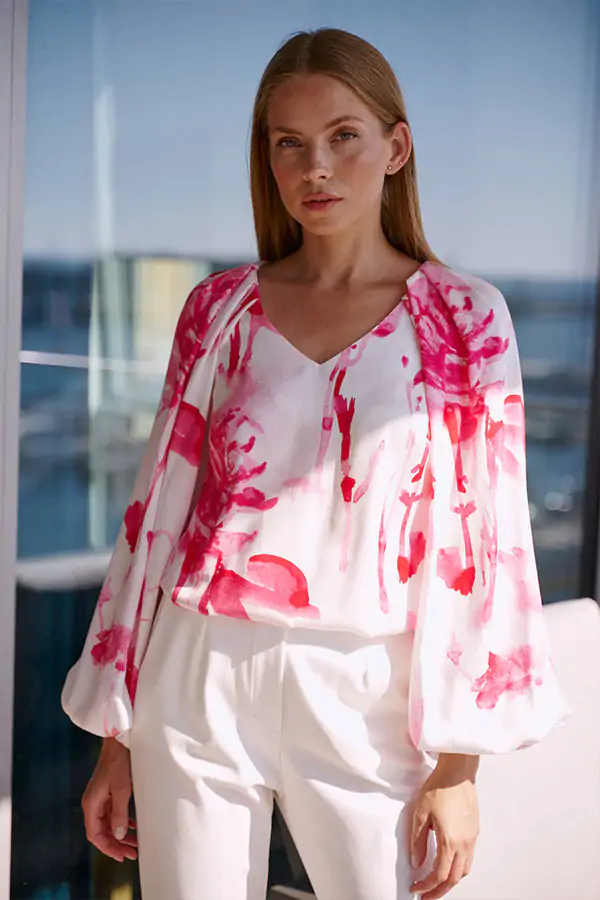 Różowy nadruk dodaje bluzce oryginalności i sprawia, że jest ona idealna zarówno na codzienne wyjścia, jak i na specjalne okazje.