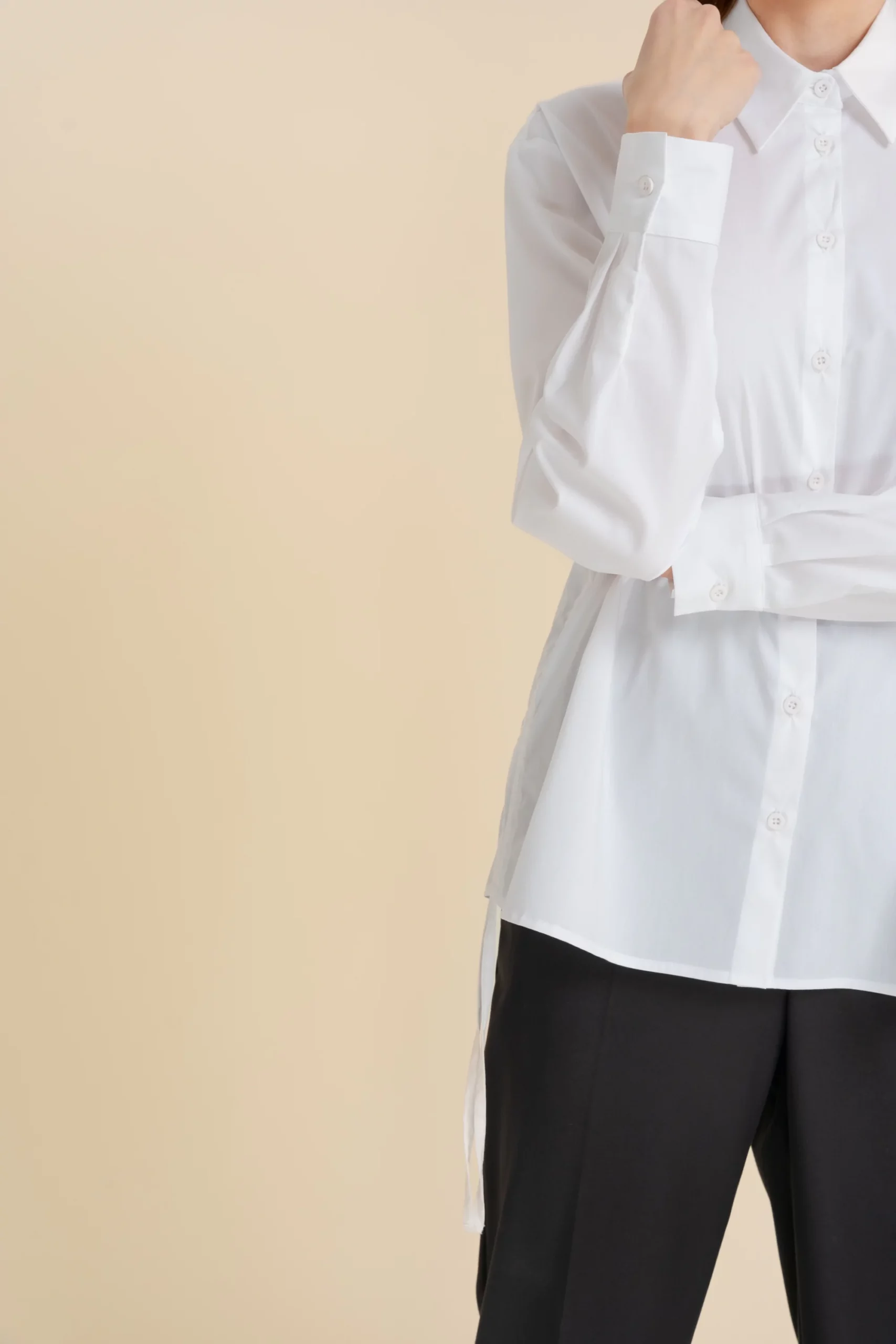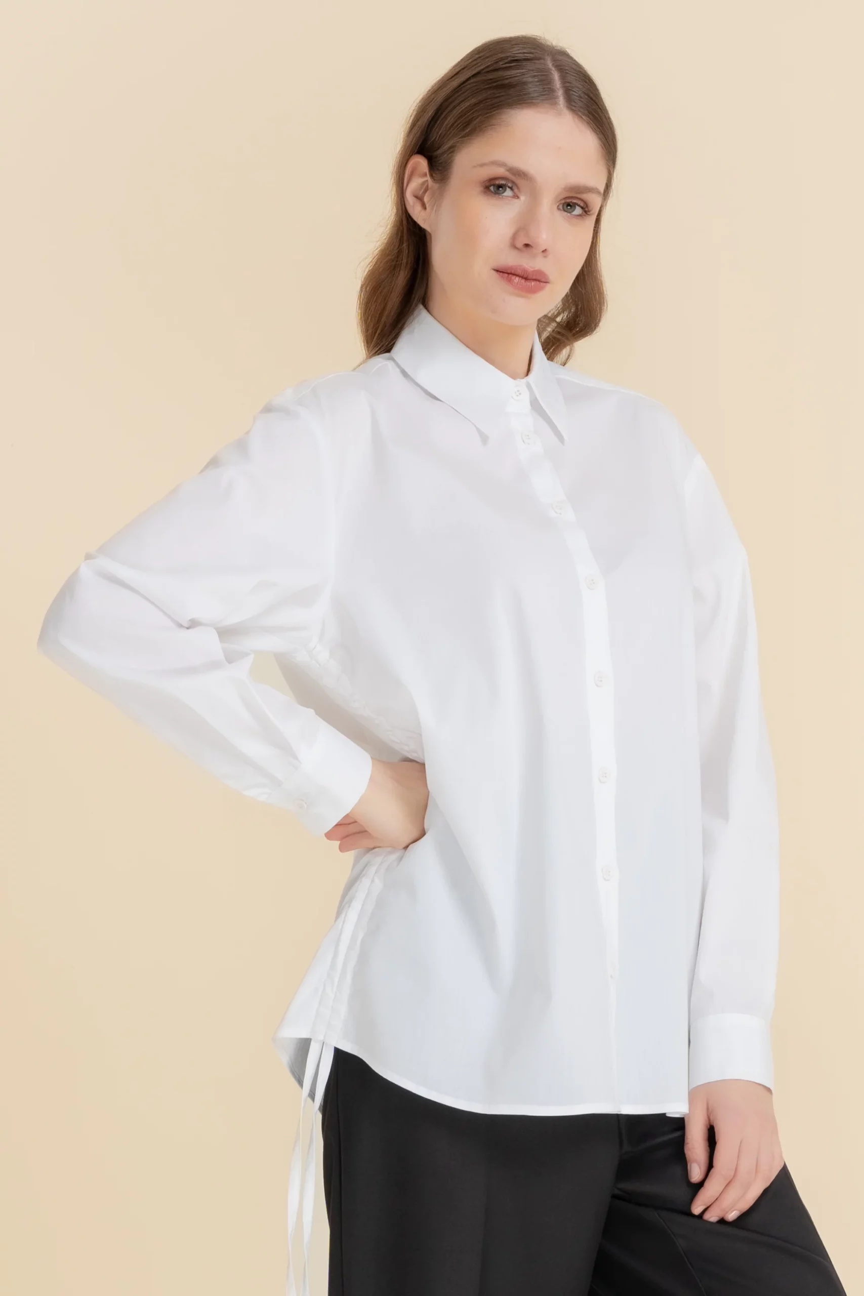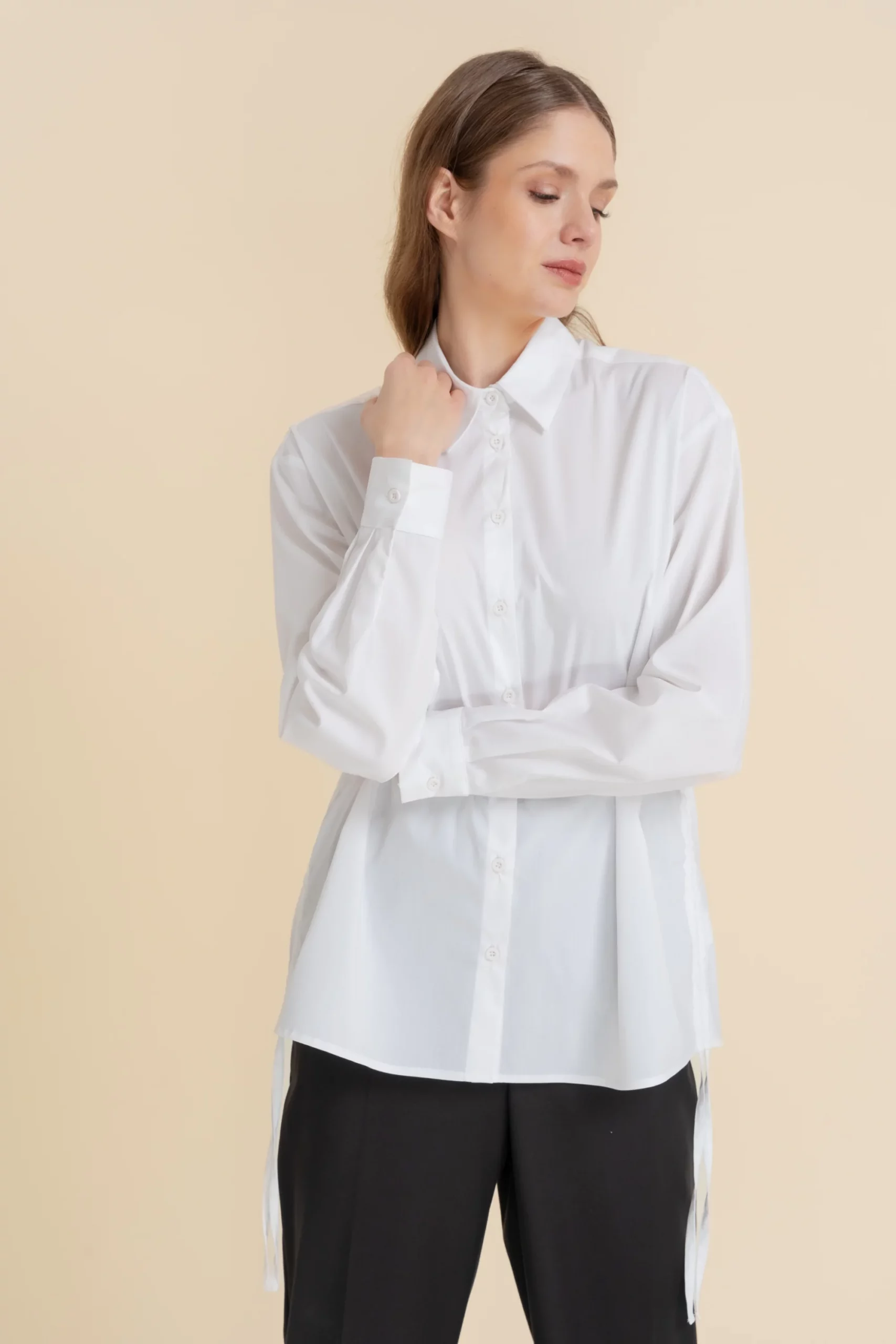 Koszula o prostym kroju. Przy dekolcie wykładany kołnierz. Wykonana w 100% z bawełnianej tkaniny. Długi rękaw zakończony mankietem zapinanym na jeden guzik. Zapinana na rząd białych guzików. Po bokach ściągacze.