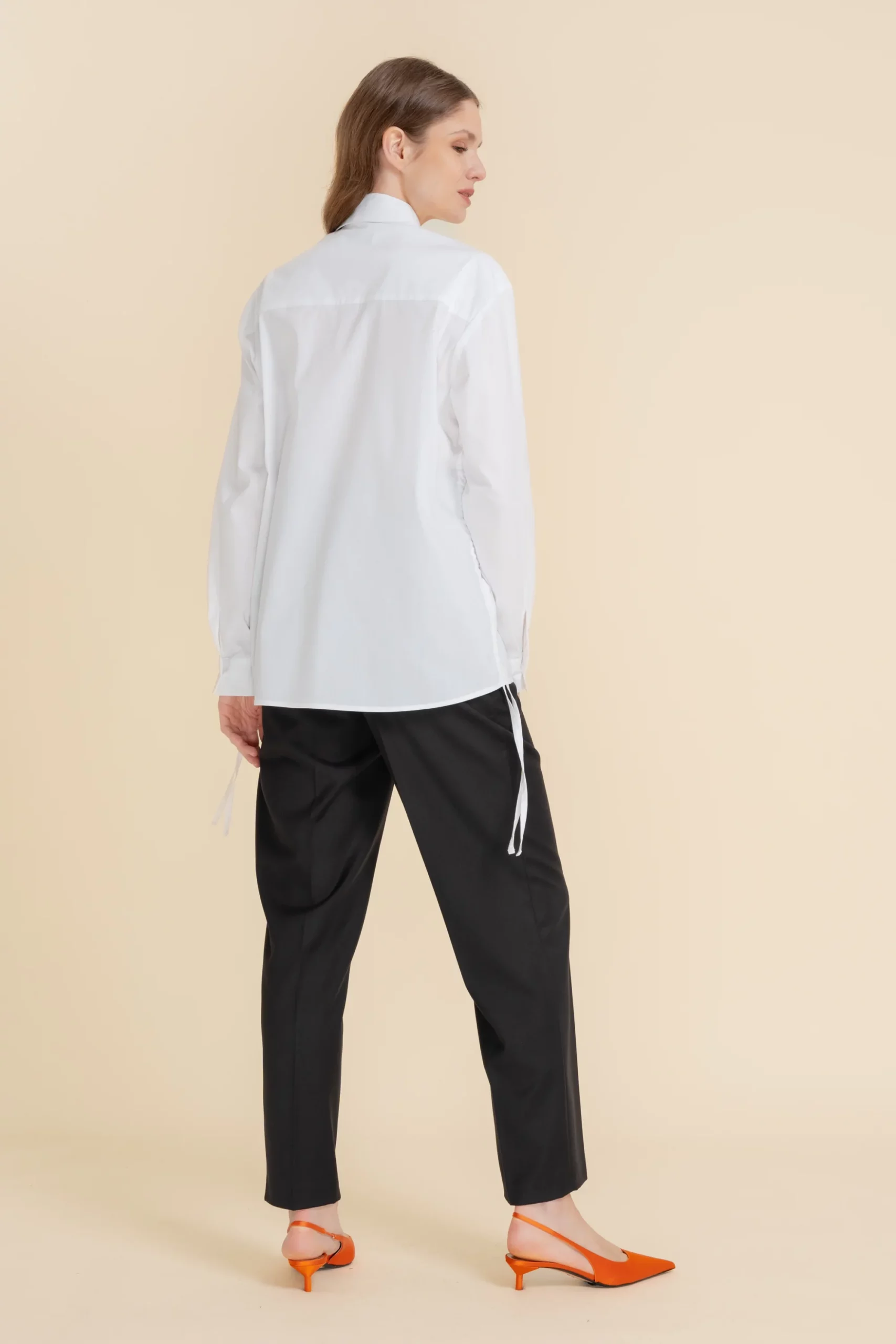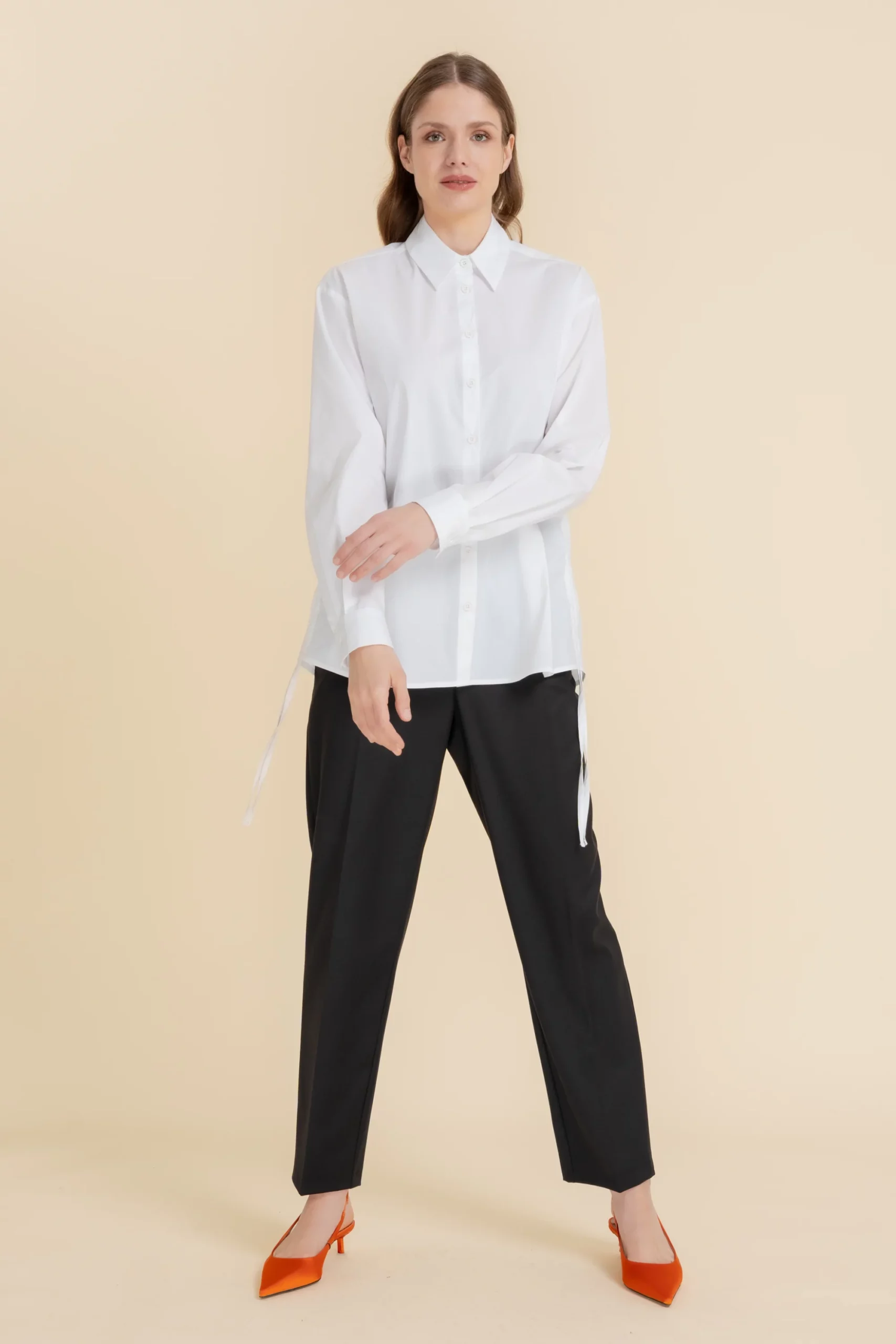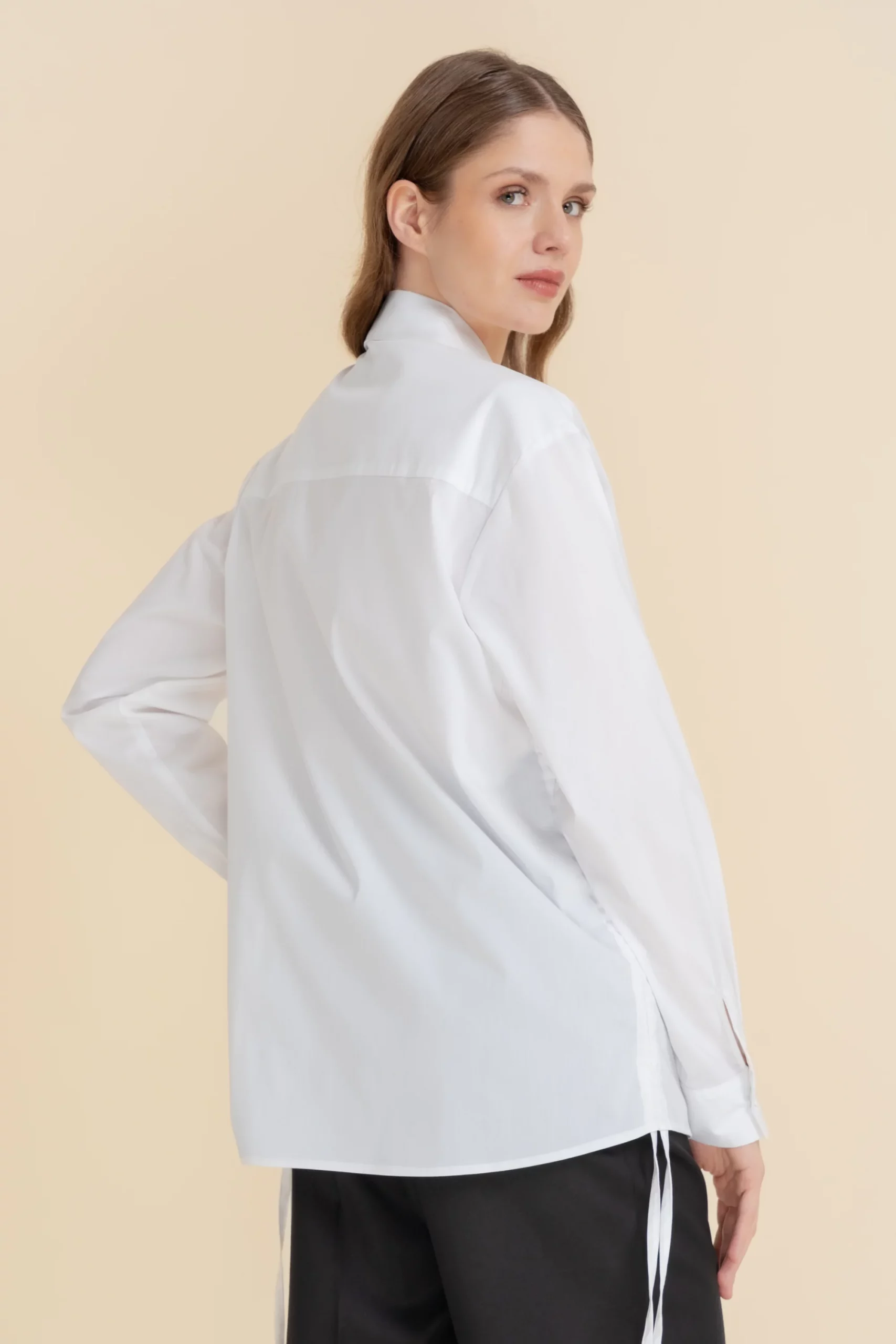 Koszula o prostym kroju. Przy dekolcie wykładany kołnierz. Wykonana w 100% z bawełnianej tkaniny. Długi rękaw zakończony mankietem zapinanym na jeden guzik. Zapinana na rząd białych guzików. Po bokach ściągacze.