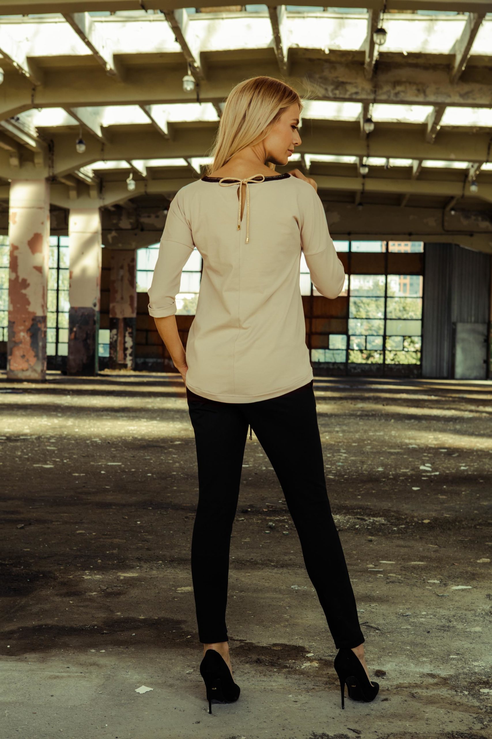 Beżowa, bawełniana bluzka z dekoracyjną aplikacją/napisem Chic, dłuższy tył wysmukla sylwetkę. Przy dekolcie wykończona pliską z czarnego szyfonu z wciągniętym złotym sznurkiem. Dół z regulacją . Rękawy wykończone ściągaczem.