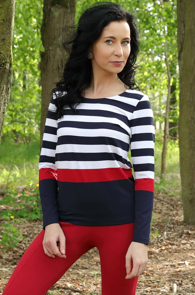 Bluzka wiskozowa w klasycznej kolorystyce, w paski. Okrągły dekolt, długi rękaw, prosty krój. Dzięki wiskozowej dzianinie bluzka jest bardzo wygodna i komfortowa w użytkowaniu.