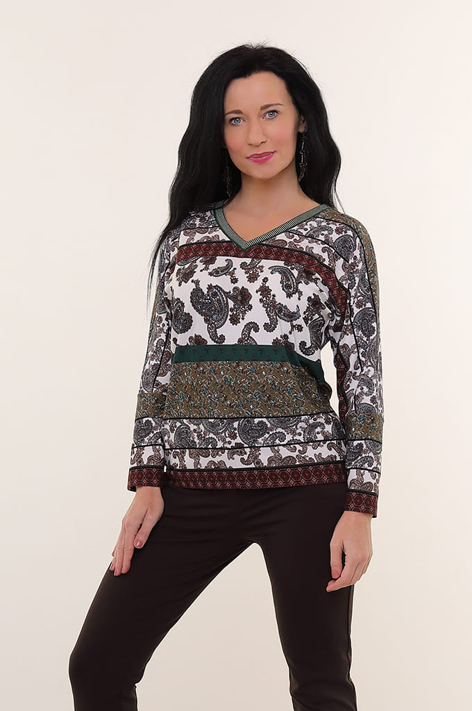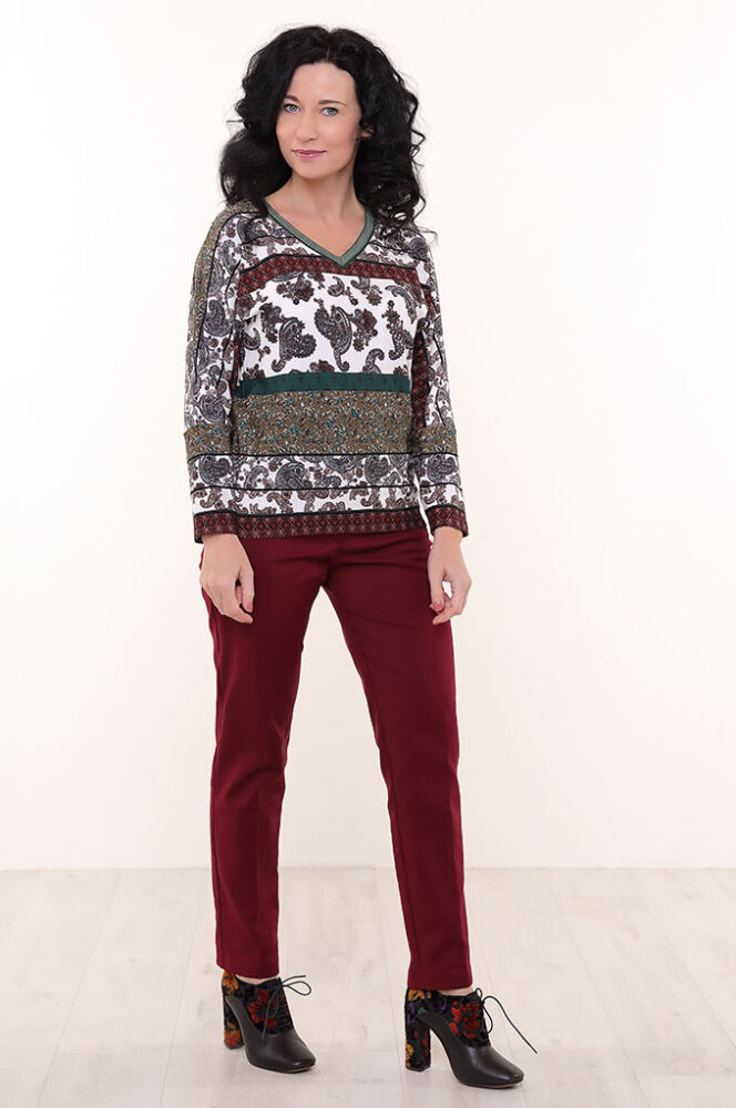 Wiskozowa bluzka z kimonowym rękawem, lekko zwężana do dołu. Dekolt V, odszyty kontrastową plisą. Uszyta z bardzo przyjemnej i doskonałej gatunkowo wiskozowej dzianiny.