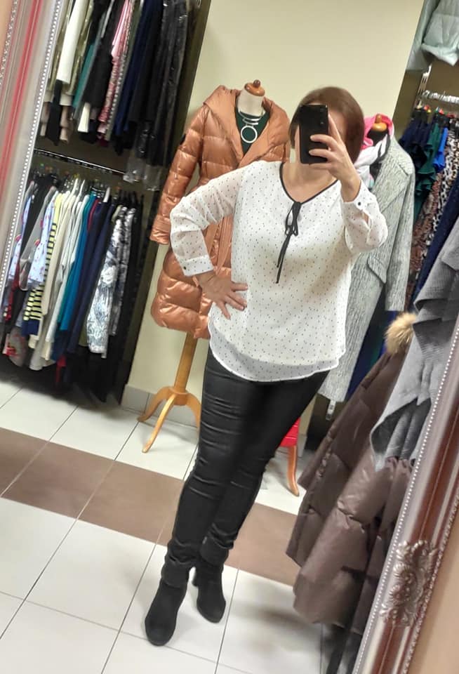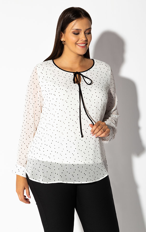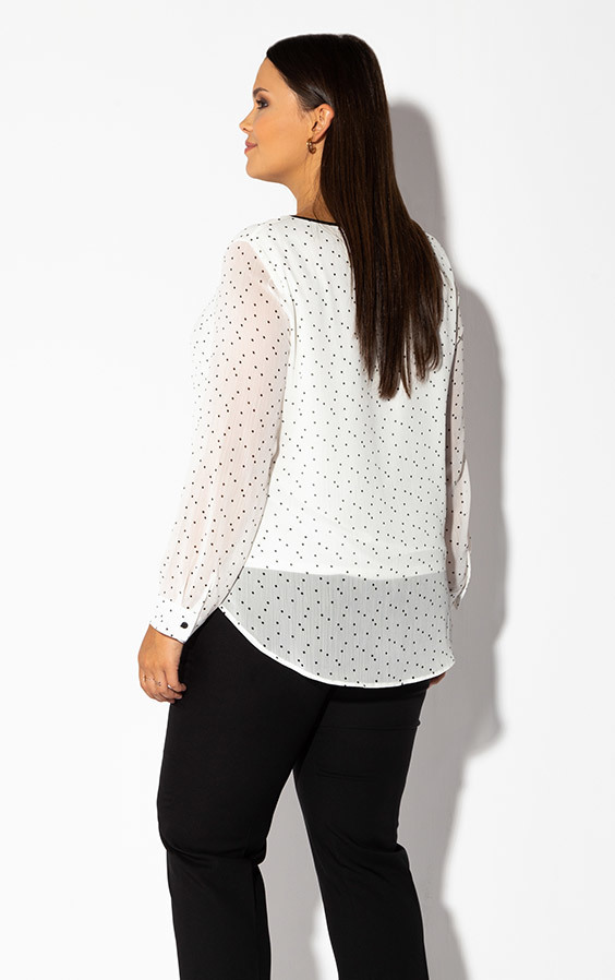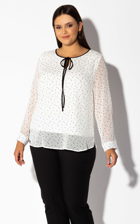 Dwuwarstwowa bluzka ecru w czarne kropeczki z elastyczną, wiskozową podszewką. Okrągły dekolt z wycięciem, czarną lamówką i ozdobnym wiązaniem. Rękawy z mankietami zapinanymi na guziczek. Bardzo elegancka i urocza propozycja do pracy i na wyjścia. Zaokrąglony dół z delikatnymi rozcięciami po bokach.