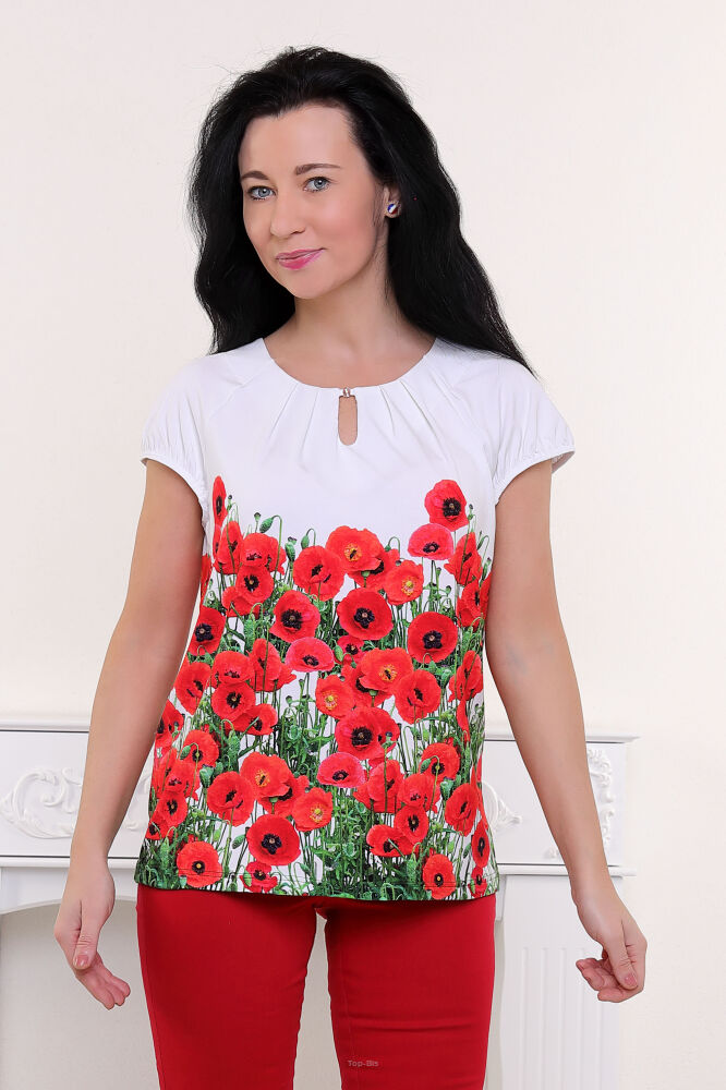 Wiskozowa, dzianinowa bluzka z motywem kwiatowym. Dekolt okrągły z małą łezką, przy dekolcie małe zakładki, rękawki raglanowe, lekko przymarszczone i ujęte w lamówkę. Niewątpliwą ozdobą bluzki jest piękny motyw makowej łąki.