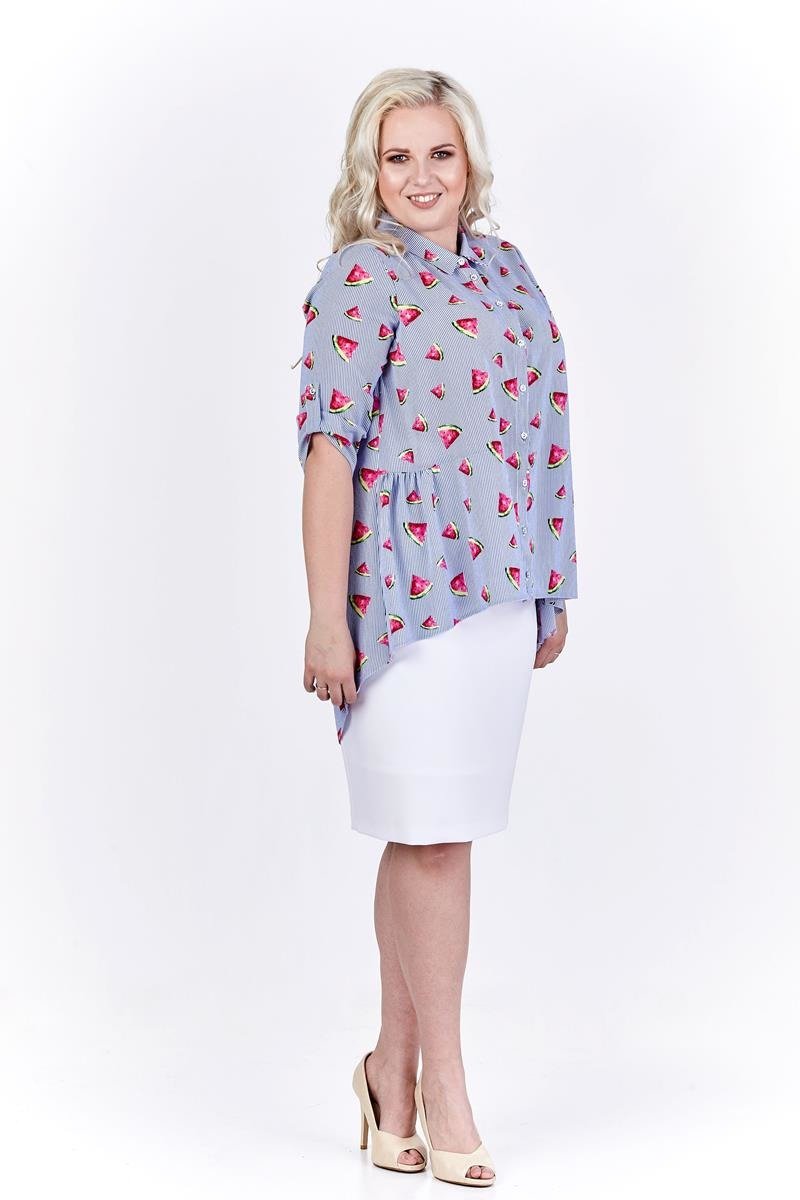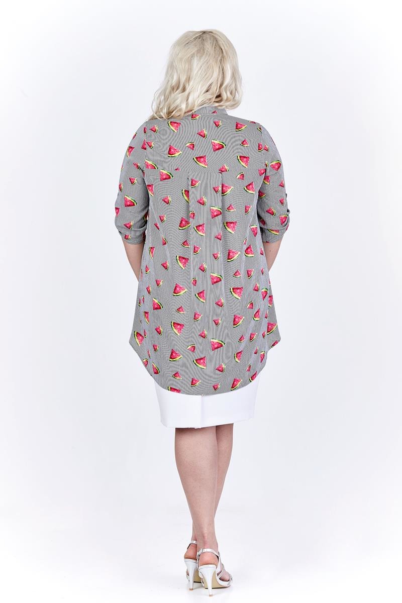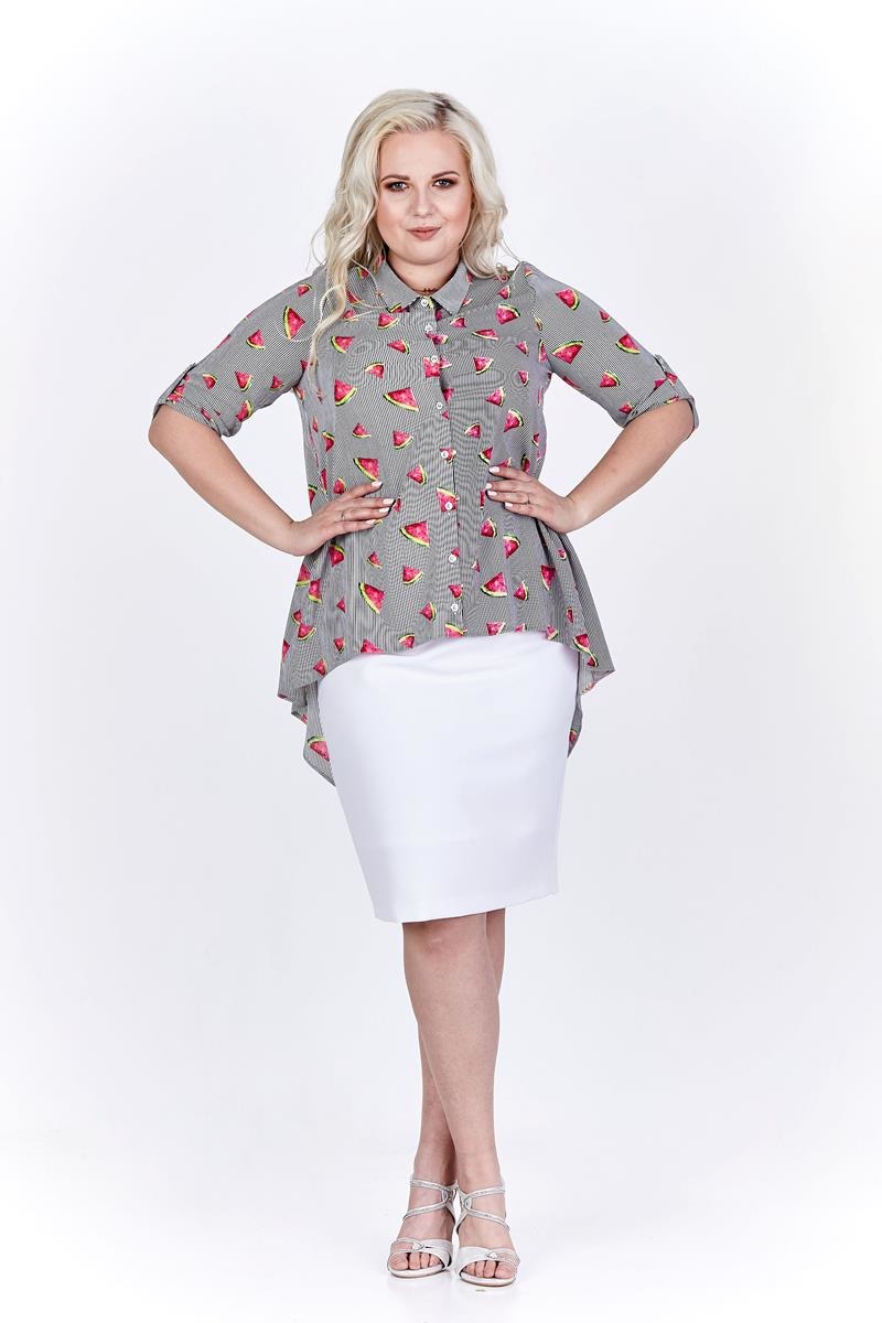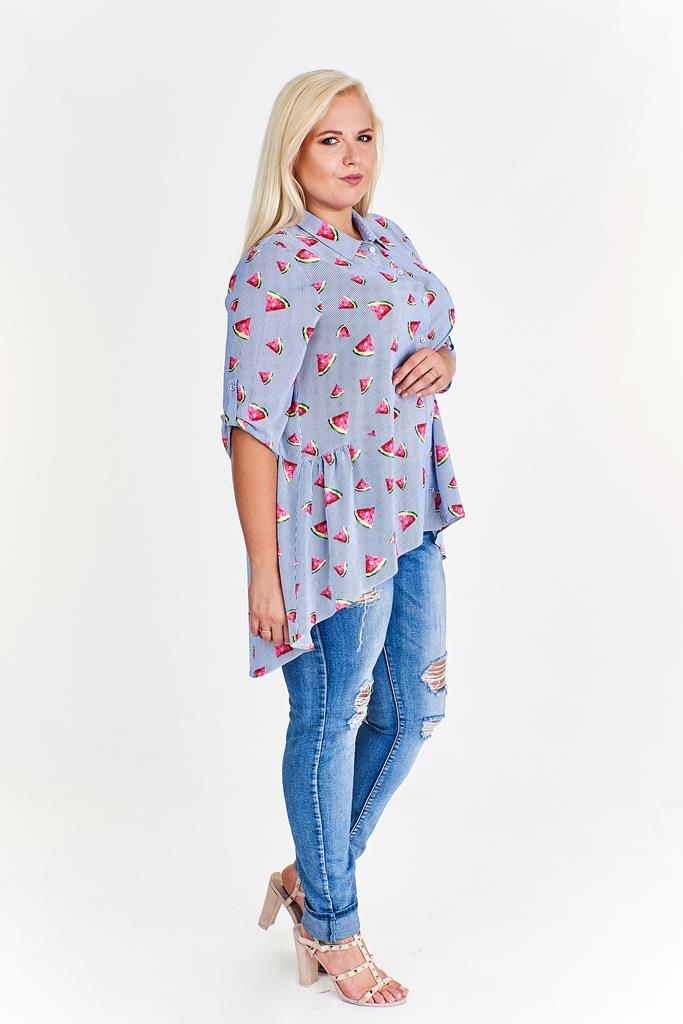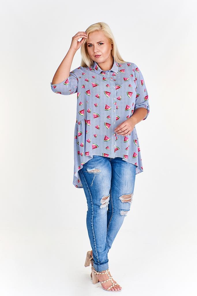 Fantazyjna bluzka z dłuższym tyłem i podwijanymi rękawami.  Ciekawy print w arbuzy nadaje jej lekkiego charakteru. Idealna do spodni i spódnicy. Uszyta w Polsce. Czas wysyłki 1-2 dni.