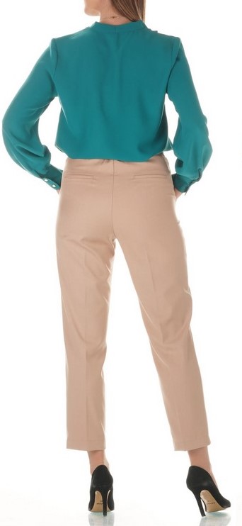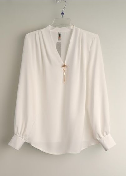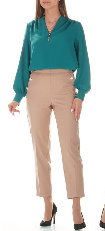 Elegancka bluzka z pięknym dekoltem V, zachodzącym lekko na szyję, świetnie wygląda z żakietami i marynarkami, uzupełnia elegancko dekolt.. Ozdobne rękawy z guzikami. Przypinana broszka.