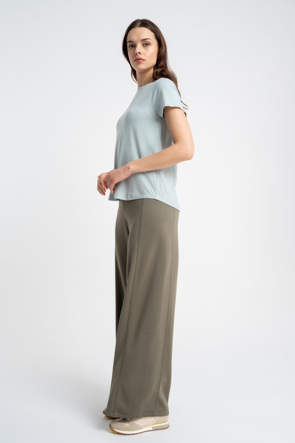 Prosta i wygodna bluzka w subtelnym odcieniu szałwi z nutą błękitu, który dodaje stylizacji świeżości. Model z krótkim rękawem i okrągłym dekoltem wykończonym prążkowaną lamówką. Wykonana z miękkiej dzianiny wiskozowej z dodatkiem elastanu, dzięki czemu jest przyjemna w noszeniu i dobrze dopasowuje się do sylwetki. Idealna do codziennych i eleganckich stylizacji. Uszyte w Polsce.