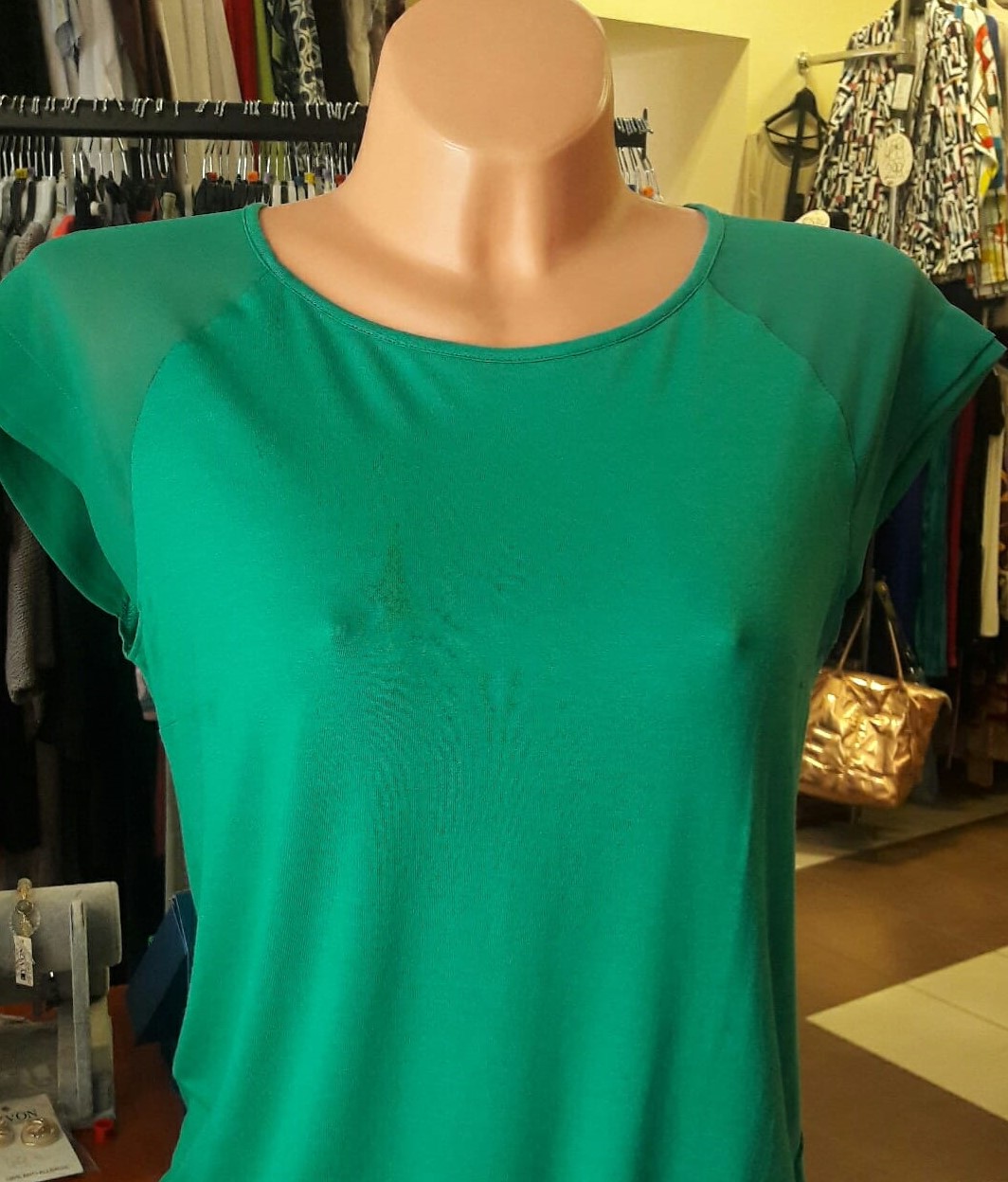 Wiskozowa bluzka z ozdobnymi elementami z szyfonu na ramieniu. Okrągły dekolt, bardzo miła i świetna gatunkowo dzianina.