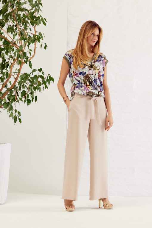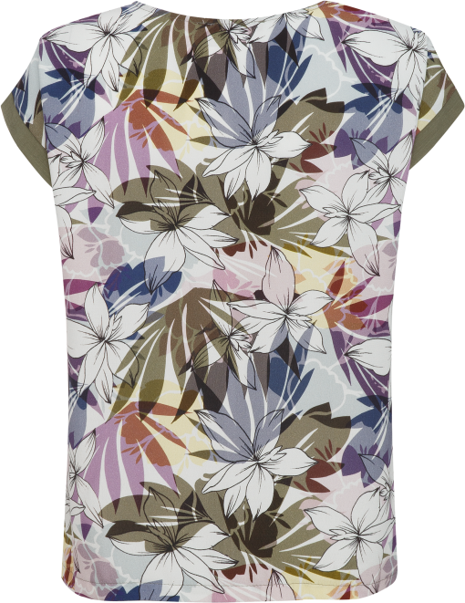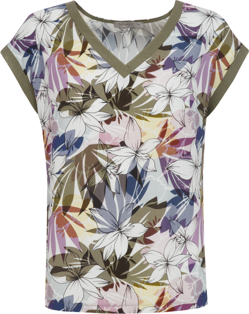 Bluzka z rękawami typu kimono, dekolt V. Dekolt i rękawy wykończone oliwkową lamówką.