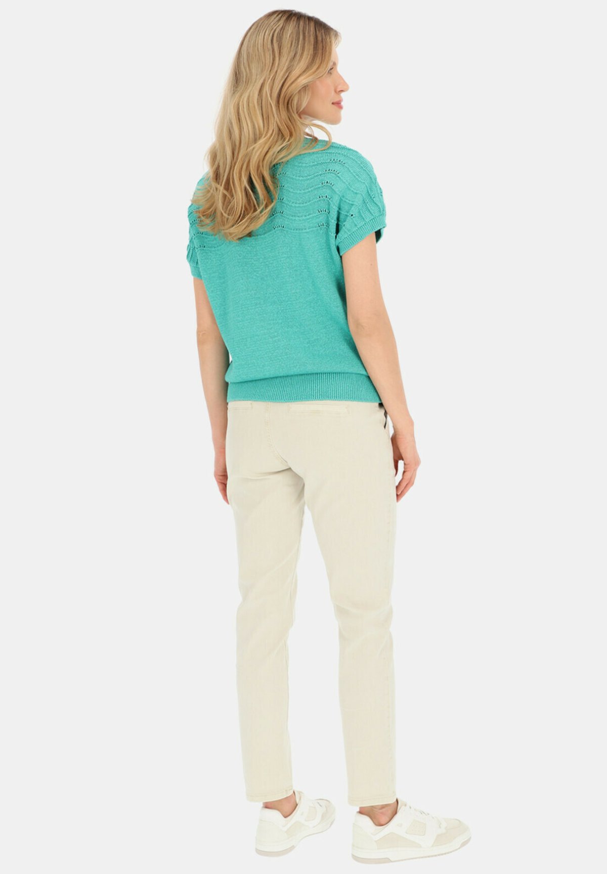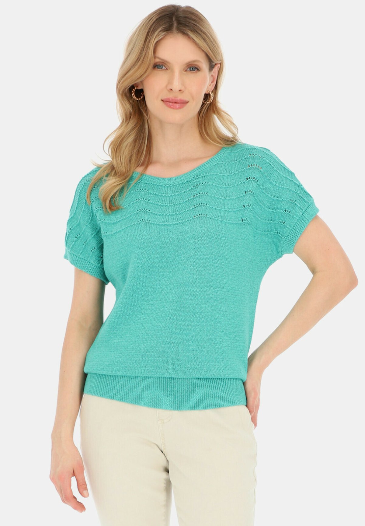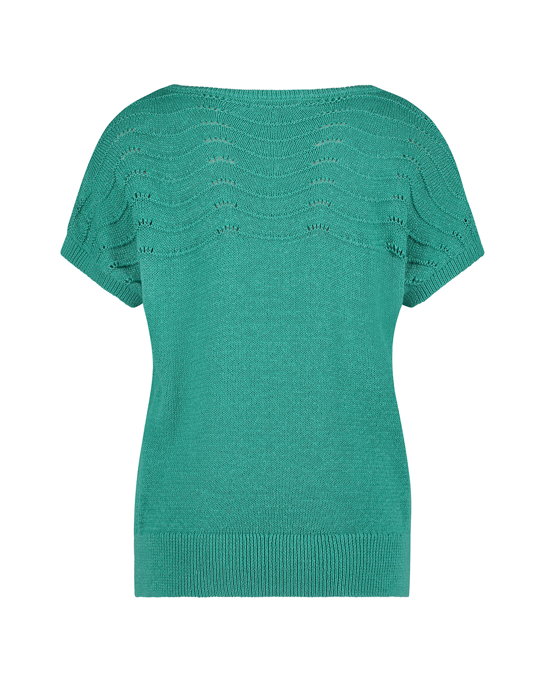 Produkt ma okrągły dekolt i ozdobny ażurowy wzór w formie fali u góry bluzki.