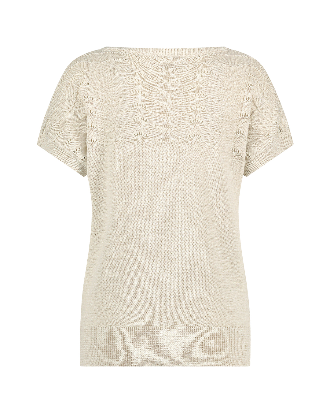 Produkt ma okrągły dekolt i ozdobny ażurowy wzór w formie fali u góry bluzki.
