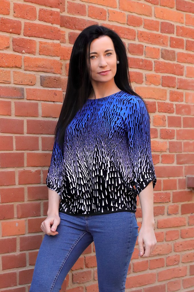 Wiskozowa bluzka z małym, okrągłym dekoltem, rękawy 7/8 z możliwością podpięcia (wszyty pasek i guzik wewnątrz rękawa). Bluzka wykończona gumką/lamówką, dodatkowo u dołu dookoła zaszyte małe szczypanki, które tworzą pas/ściągacz. Bluzka fajnie się podciąga, zbluzuje wyszczuplając dodatkowo sylwetkę.