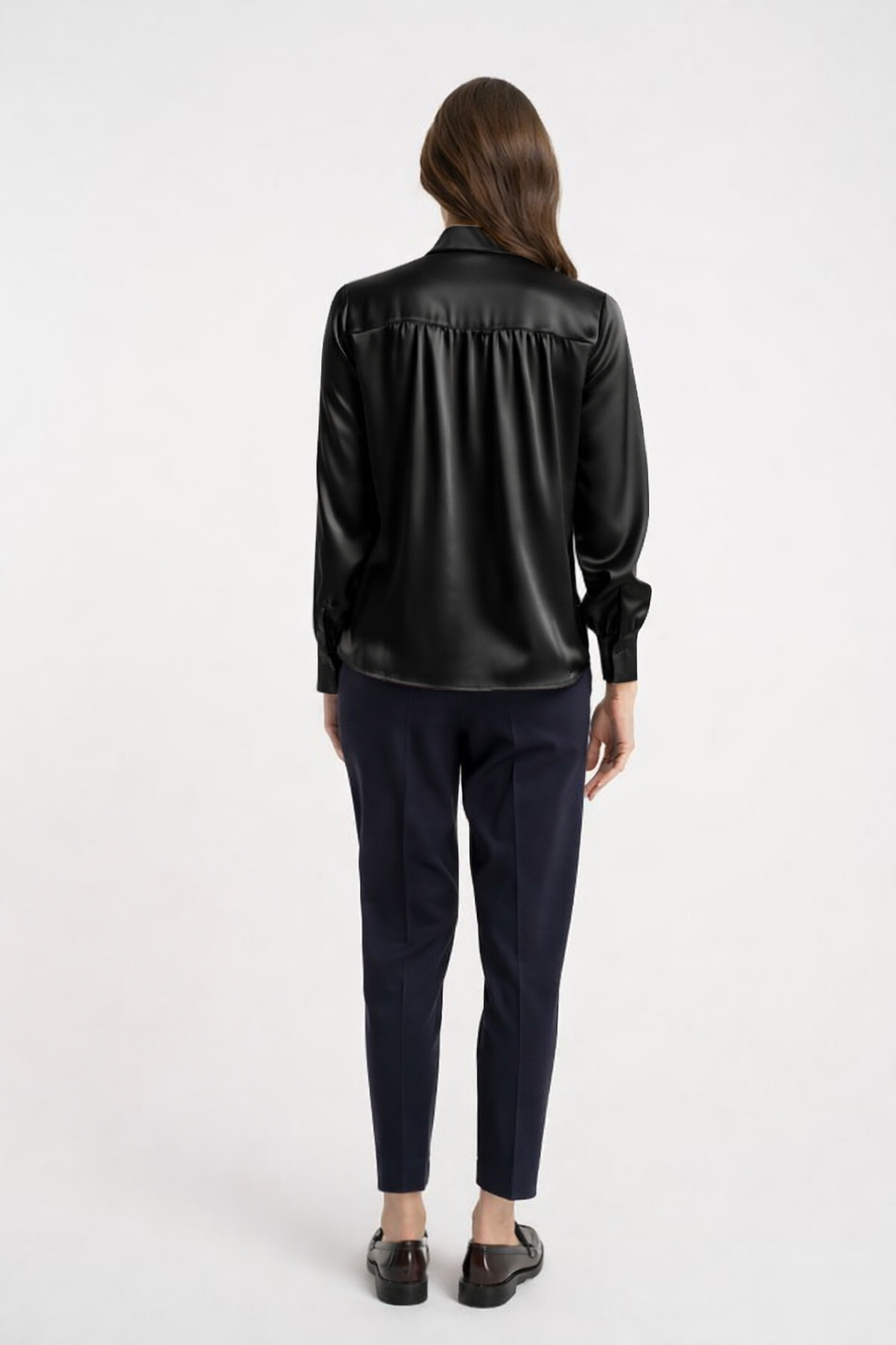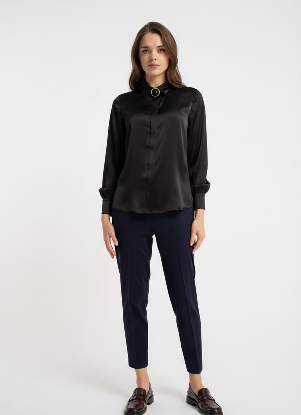 Posiada klasyczny kołnierzyk, kryte zapięcie na guziki oraz delikatnie bufiasty rękaw.