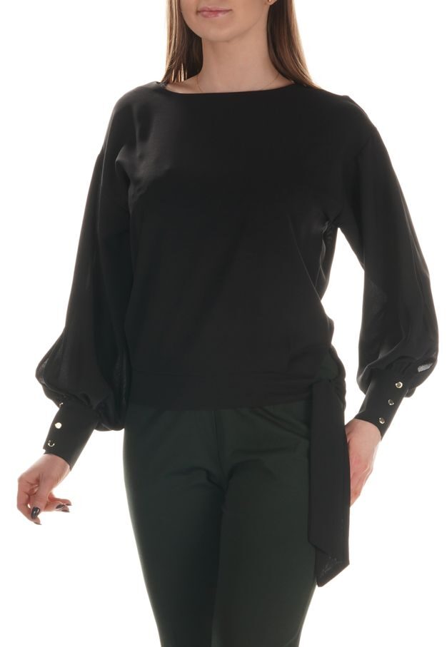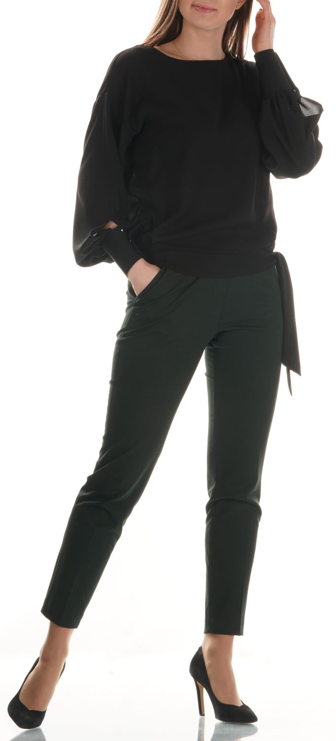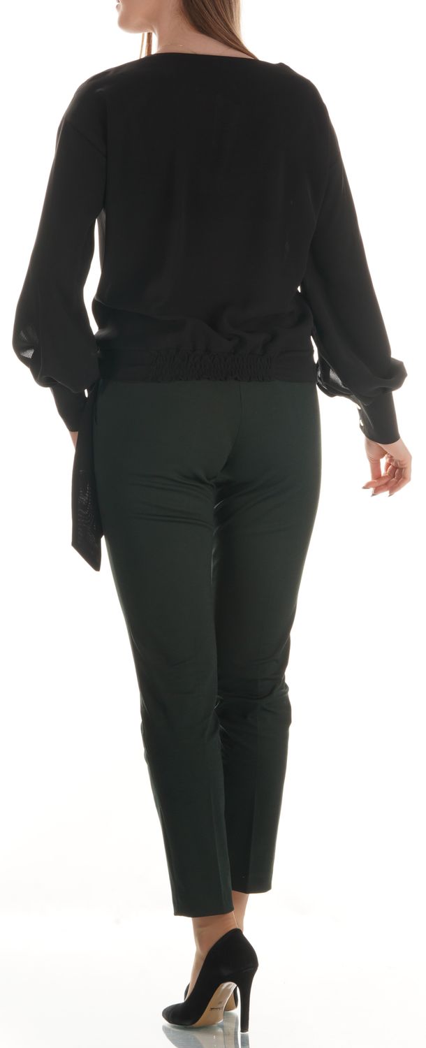 Przepiękna bluzka wiązana na boku szarfą. Gładki przód, rękaw wykończony dłuższym mankietem ze złotymi guzikami. U dołu wykończona paskiem, który przechodzi w szarfę do wiązania, dodatkowo na tyle ozdobne przeszycia marszczące pasek i dopasowujące go do sylwetki. Bardzo elegancka bluzka. Dobrze wyglądają w niej też Panie z większym biustem. Hitowy model w sprzedaży stacjonarnej. Tkanina kryjąca, nie prześwituje i nie jest śliska, w dotyku miękka i mięsista.