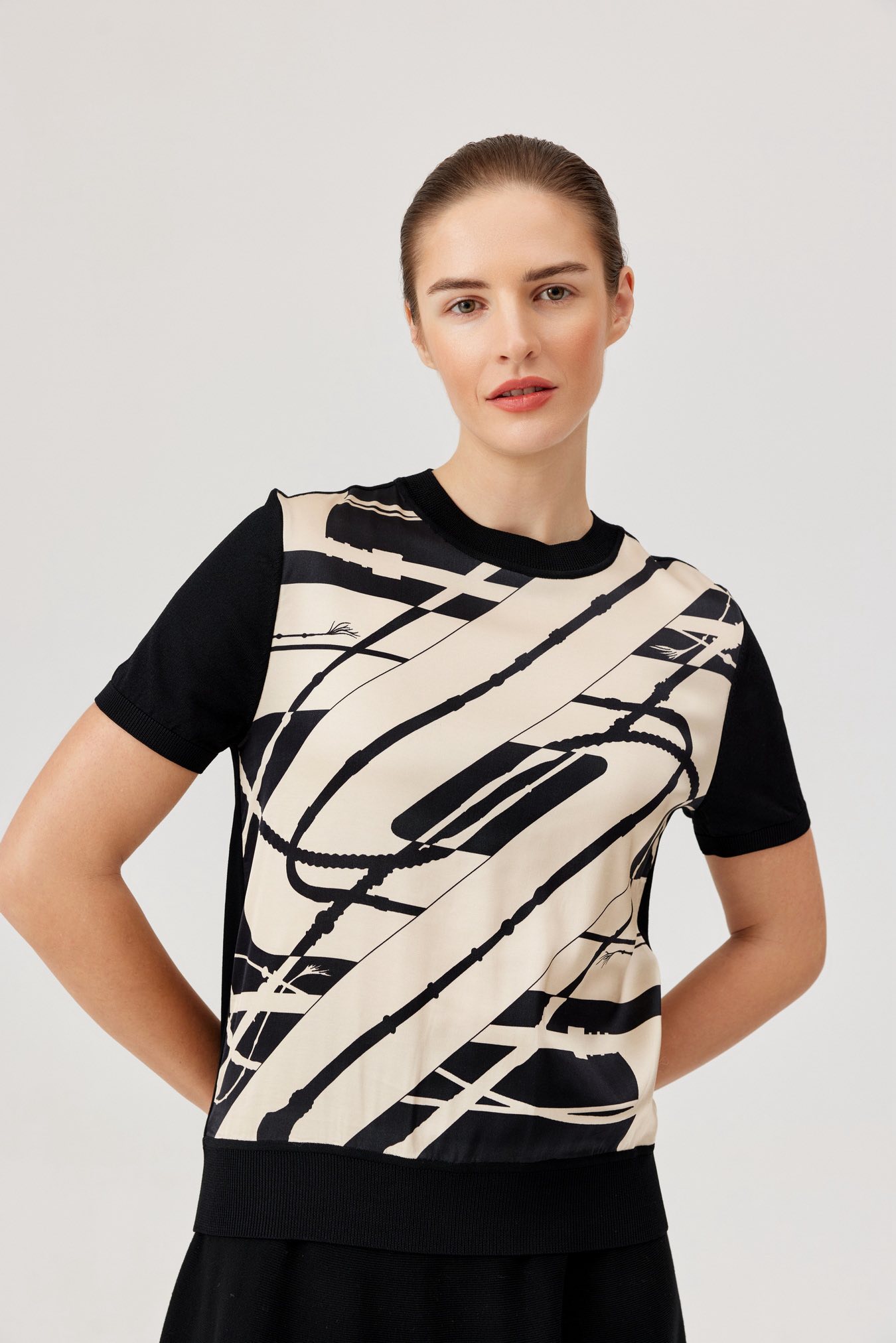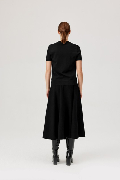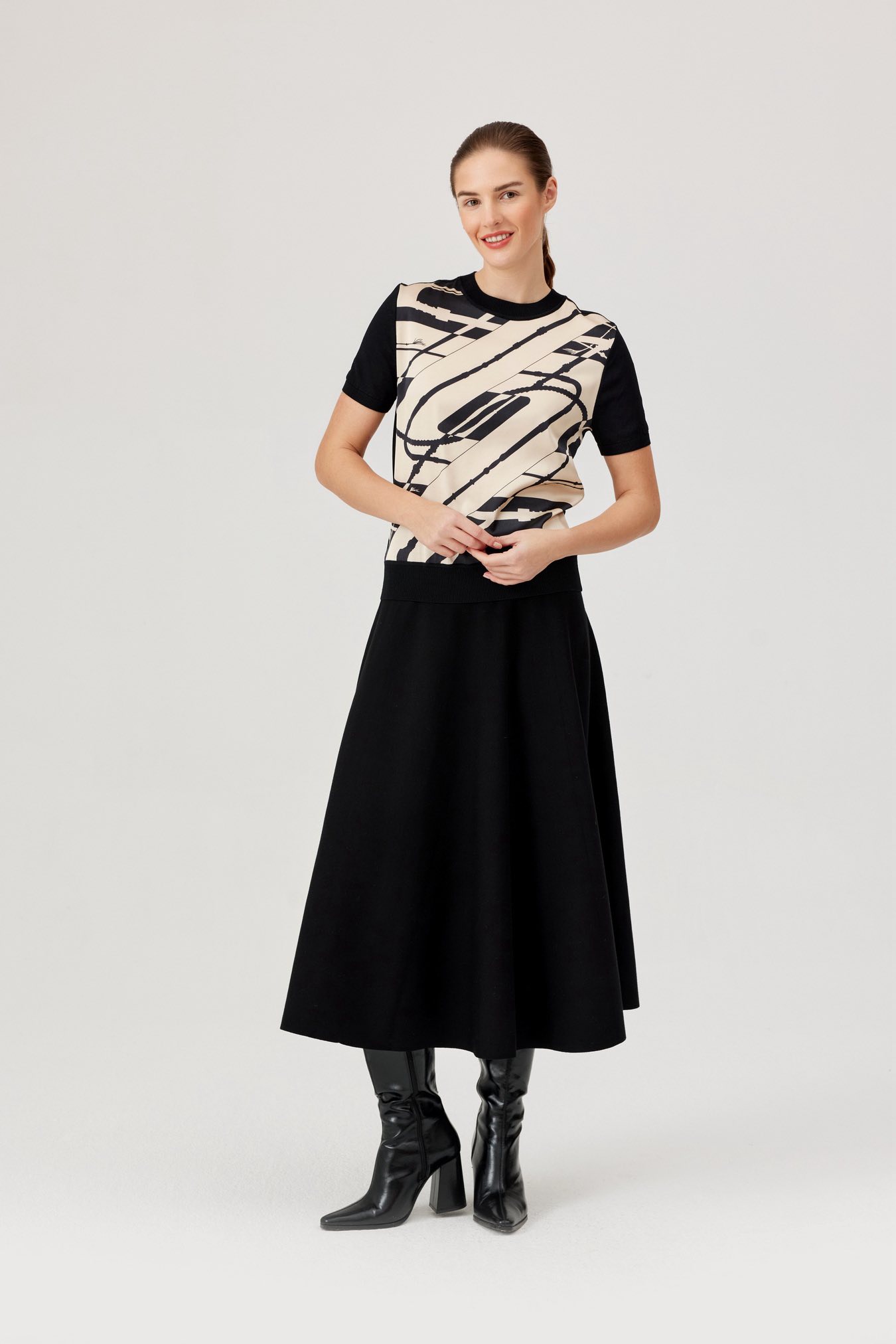 Minimalistyczna bluzka FÉRIA to ponadczasowy element garderoby, który sprawdzi się w wielu stylizacjach. Prosty fason z krótkim rękawem i okrągłym dekoltem zapewnia uniwersalność i komfort noszenia. Lekki, przyjemny w dotyku materiał subtelnie układa się na sylwetce, tworząc elegancką bazę zarówno do stylizacji casualowych, jak i bardziej formalnych. Przód z tkaniny tył z dzianiny gładki czarny.