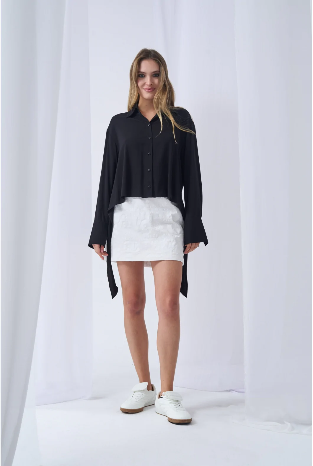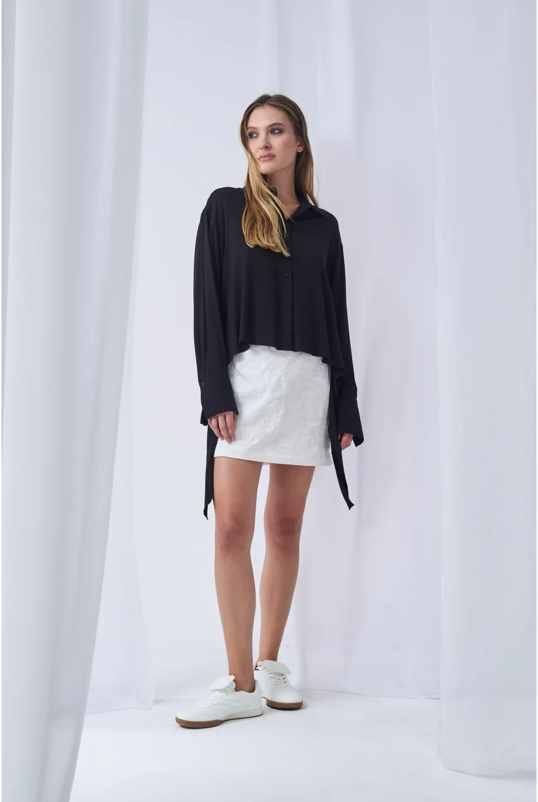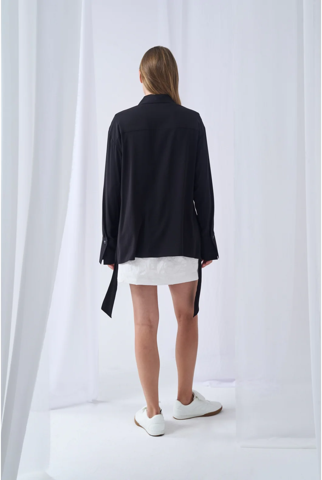 Koszula o luźniejszym kroju. Wykładany kołnierzyk. Uszyta z gładkiej, wiskozowej tkaniny. Zapinana na rząd guzików. Długie rękawy z dużym, ozdobnym mankietem zapinanym na guzik. Po bokach rozcięcia, dłuższy tył. Na końcach dwa dłuższe pasy, które można stylizować na różne sposoby.