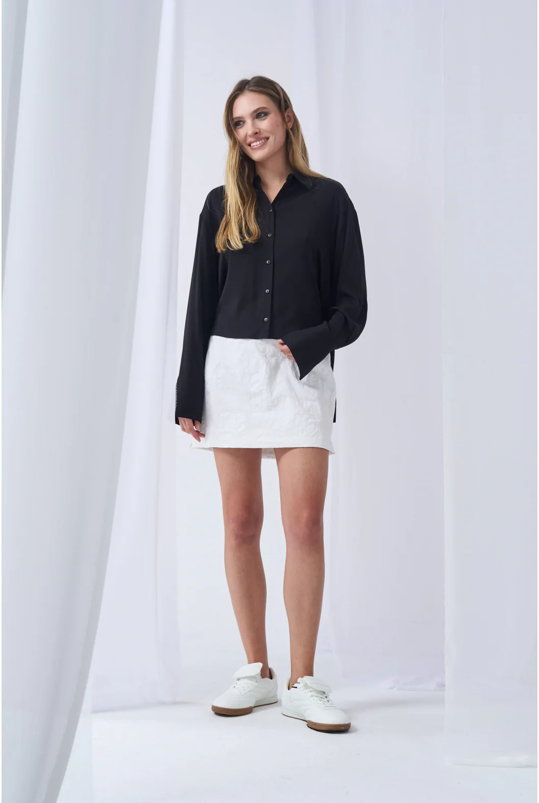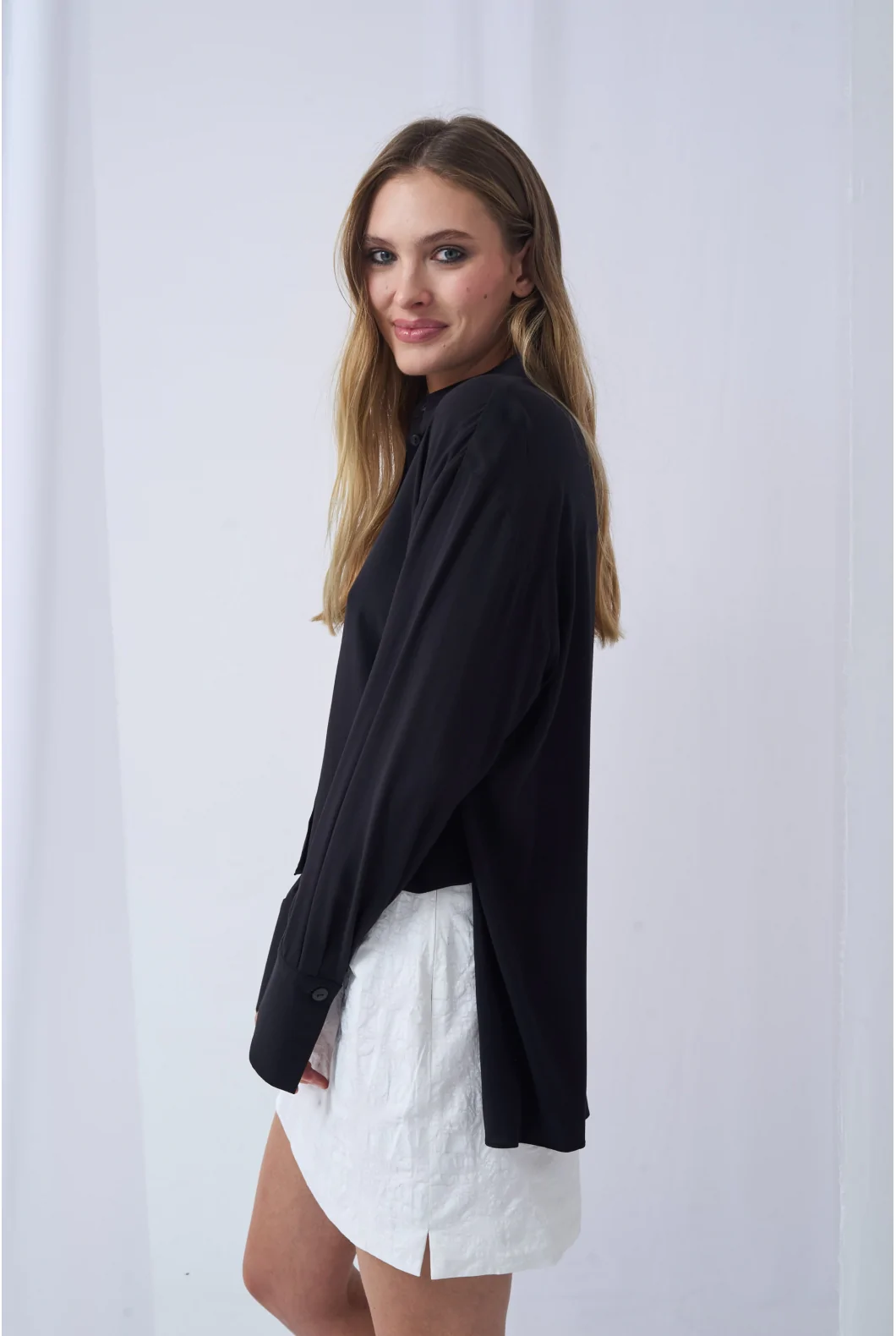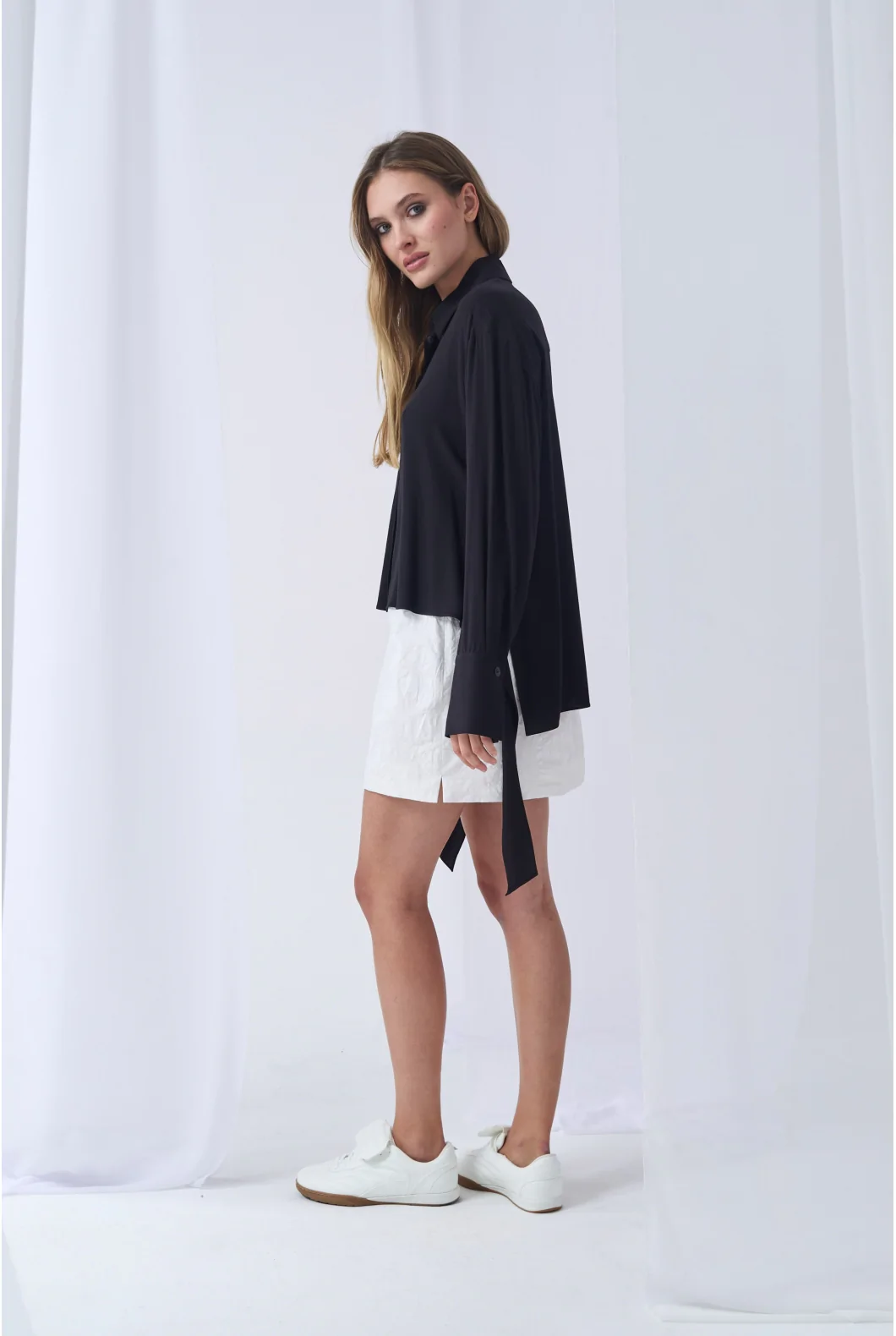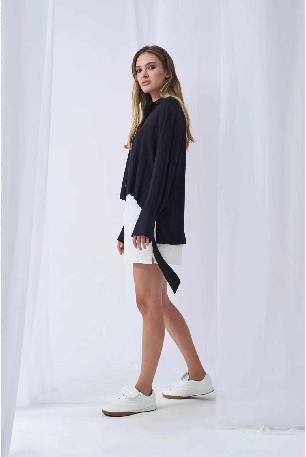 Koszula o luźniejszym kroju. Wykładany kołnierzyk. Uszyta z gładkiej, wiskozowej tkaniny. Zapinana na rząd guzików. Długie rękawy z dużym, ozdobnym mankietem zapinanym na guzik. Po bokach rozcięcia, dłuższy tył. Na końcach dwa dłuższe pasy, które można stylizować na różne sposoby.