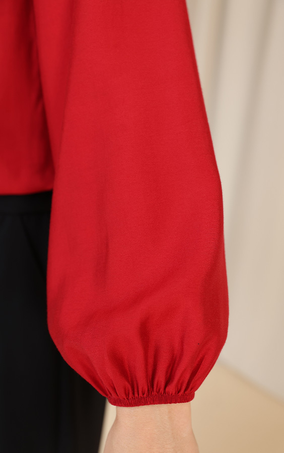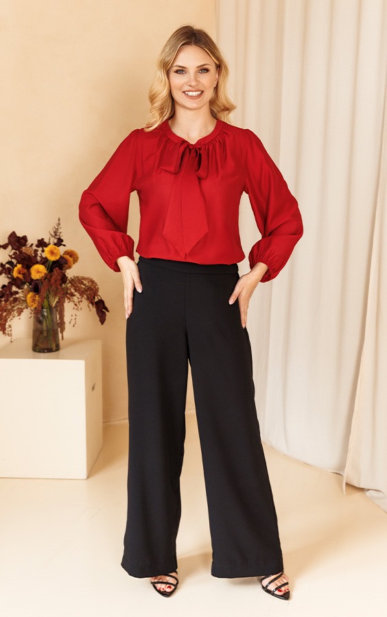 Elegancka, czerwona bluzka z ozdobnym wiązaniem. Uszyta ze szlachetnego layocelu. Bluzka posiada balonowe, modowe rękawy. Idealna do pracy i na przyjęcia. Uszyta w Polsce.