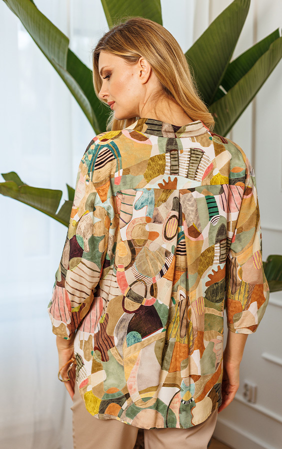Koszula Charlie przyciąga wzrok unikalnym, abstrakcyjnym printem w odcieniach ziemi, szałwii i słonecznego ochry. Jednak to jej przemyślany krój sprawia, że nie będziesz chciała jej zdjąć:
