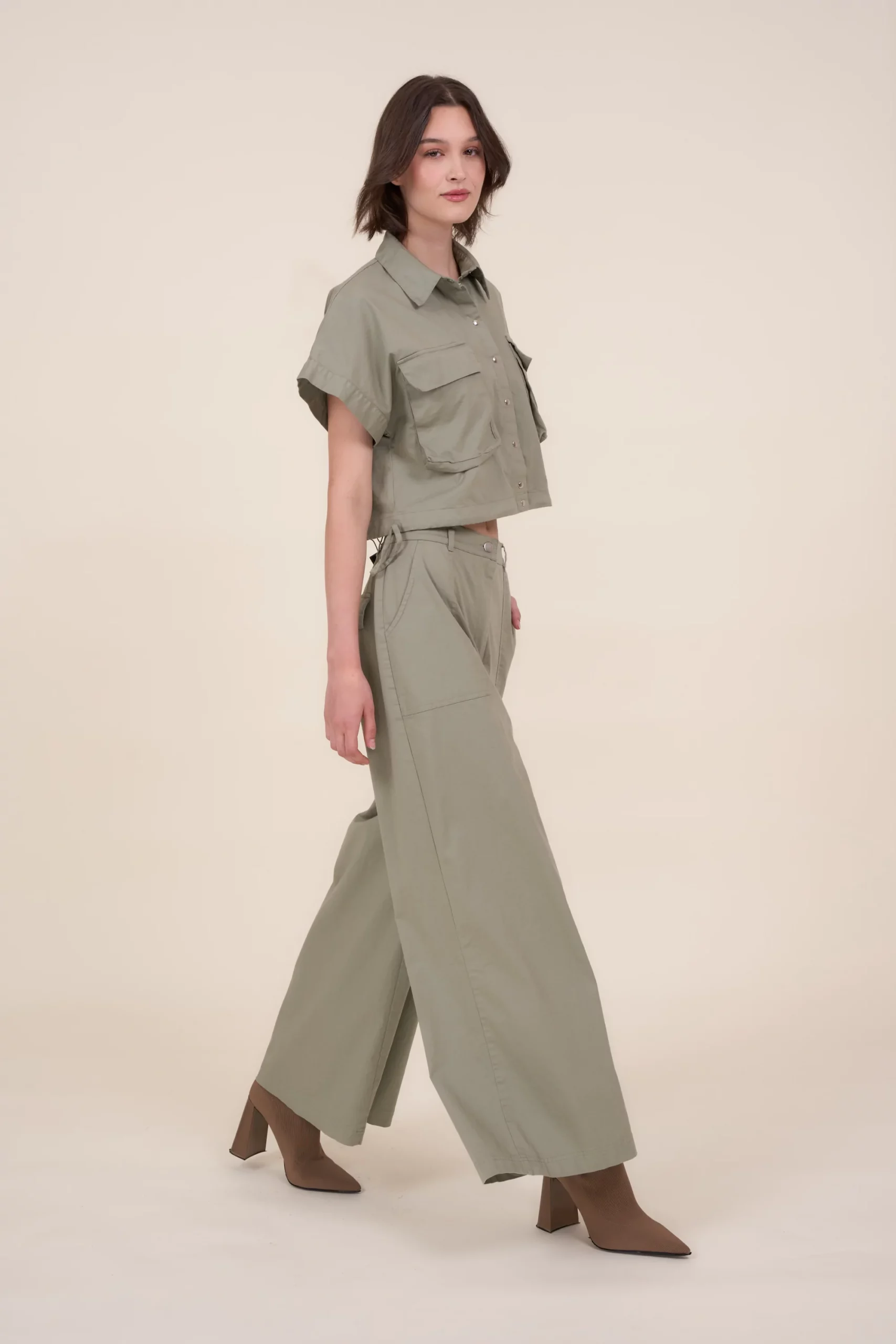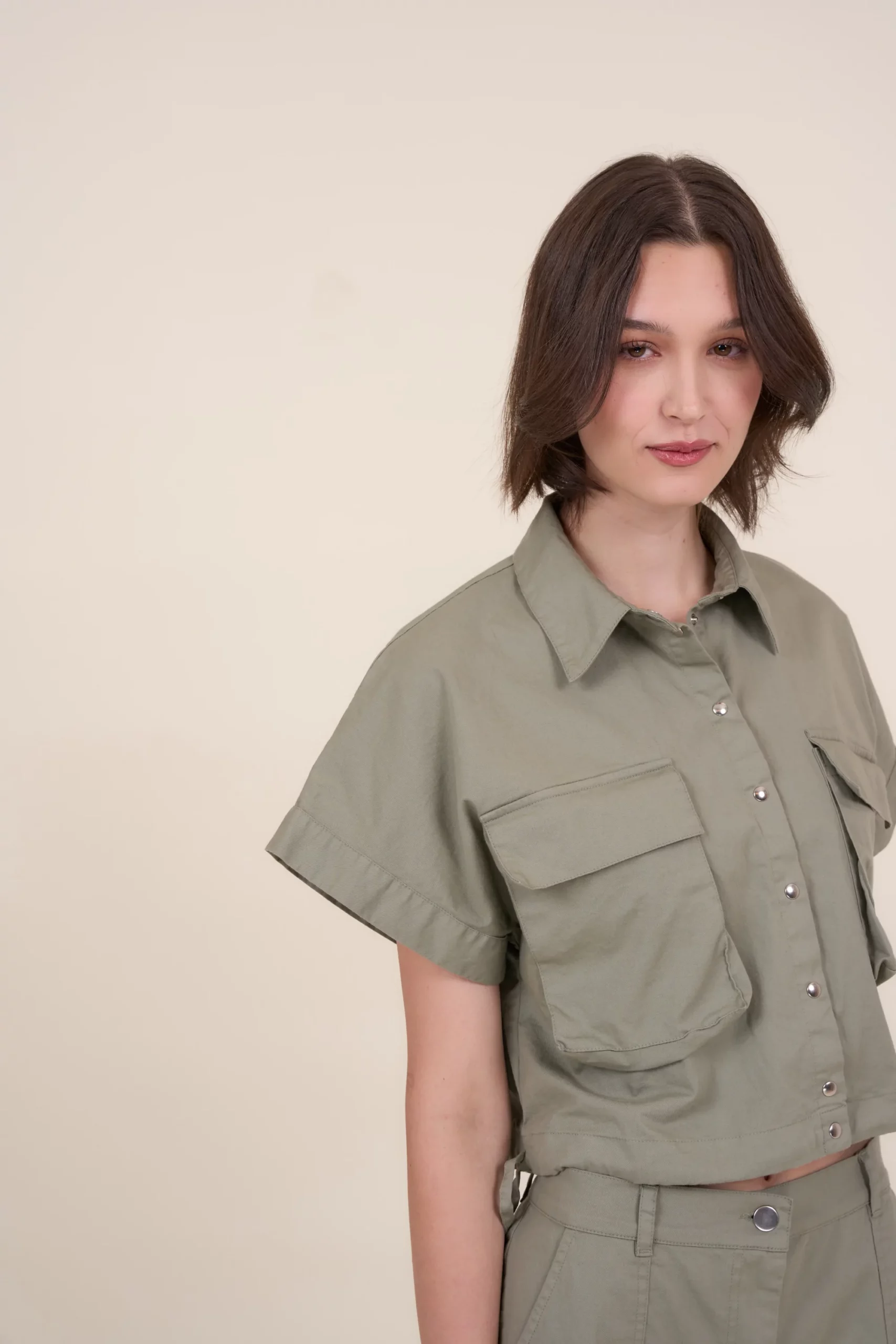 Krótka luźna kamizelka w kolorze khaki, z krótkimi szerokimi rękawami i wykładanym kołnierzykiem. Wykonana z gładkiej bawełnianej tkaniny z dodatkiem elastanu. Zapinana na metalowe napy. Na dole ściągacz umożliwiający podkreślenie talii. Z przodu dwie kieszenie. Uniwersalny model, który sprawdzi się w wielu codziennych stylizacjach.