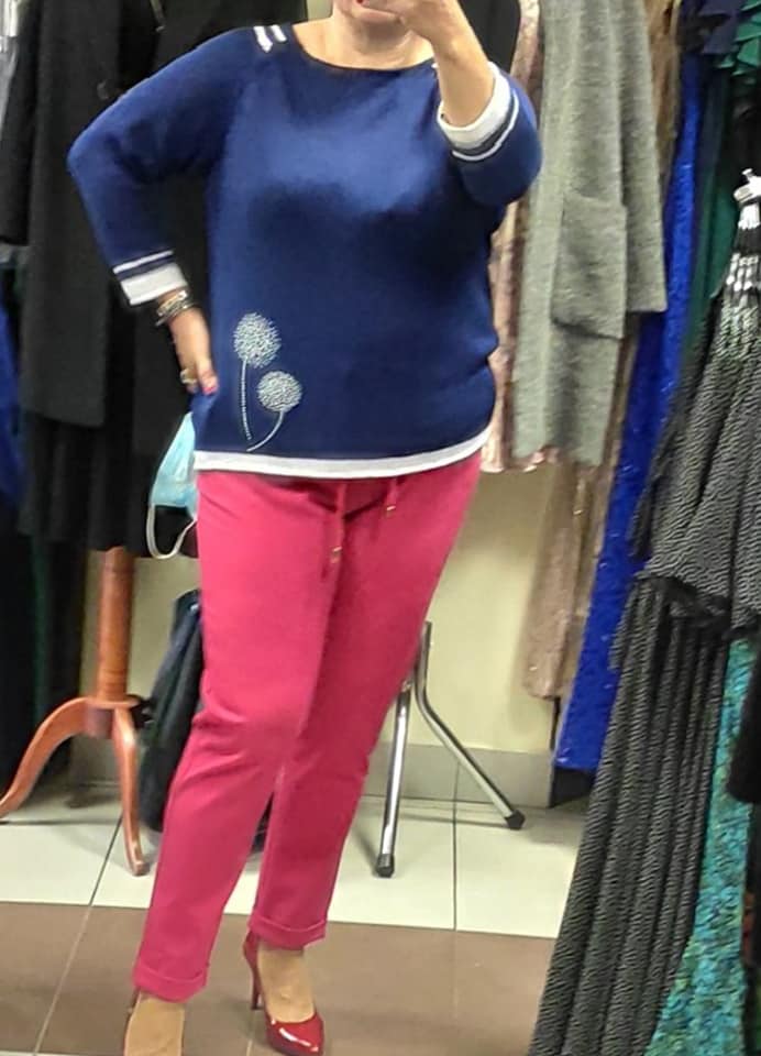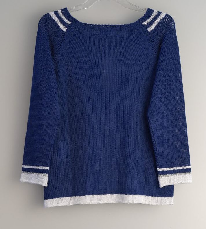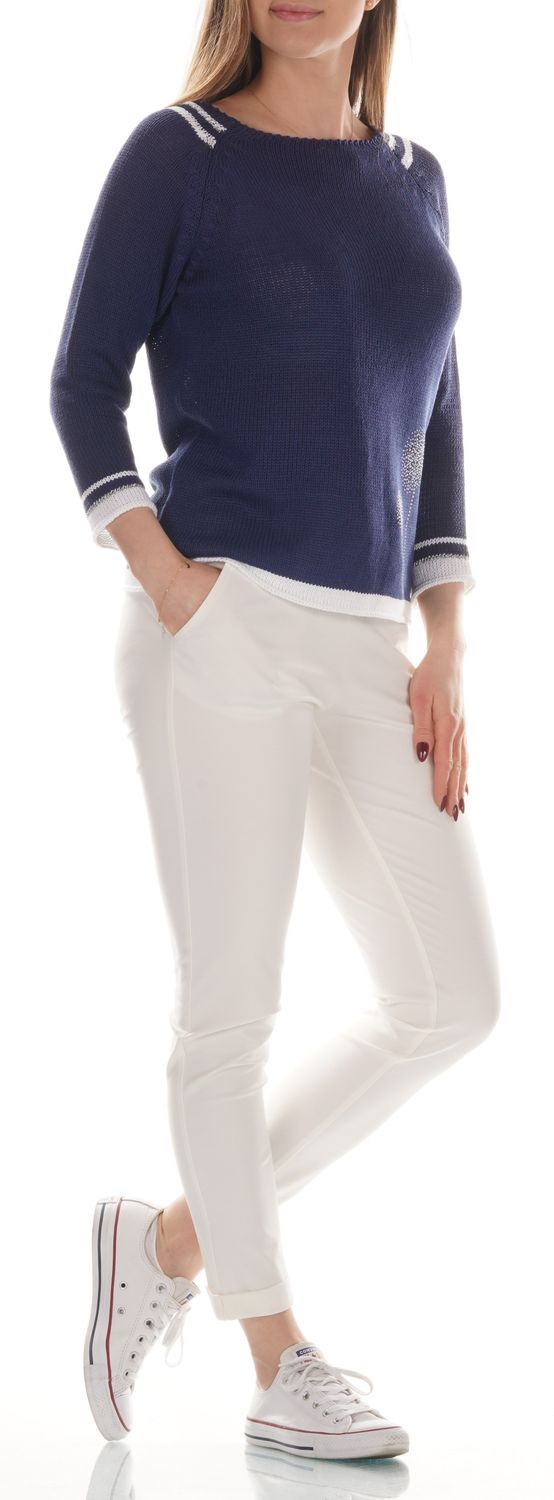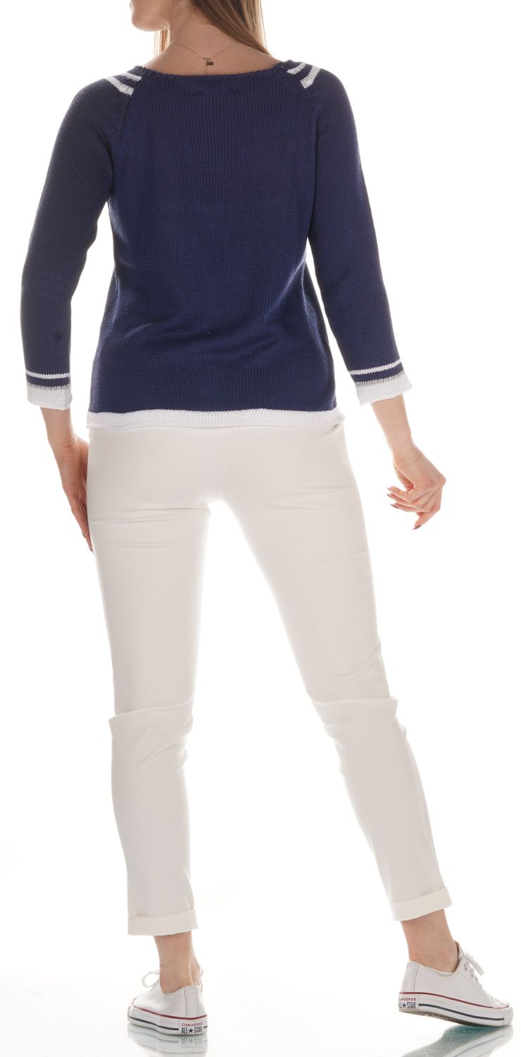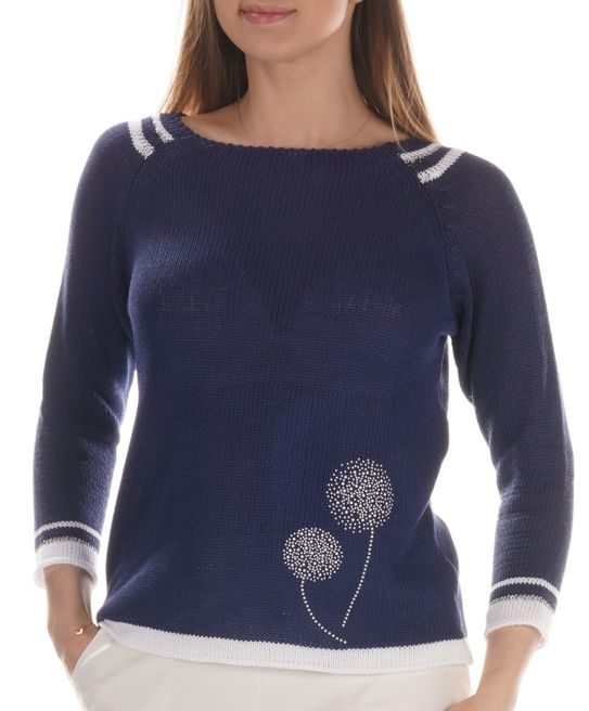 Lekki sweterek z motywem dmuchawca, w pięknej granatowo- białej kolorystyce. Świetnie sprawdzi się w wielu stylizacjach. Uszyty w Polsce. Czas wysyłki 1-2 dni.