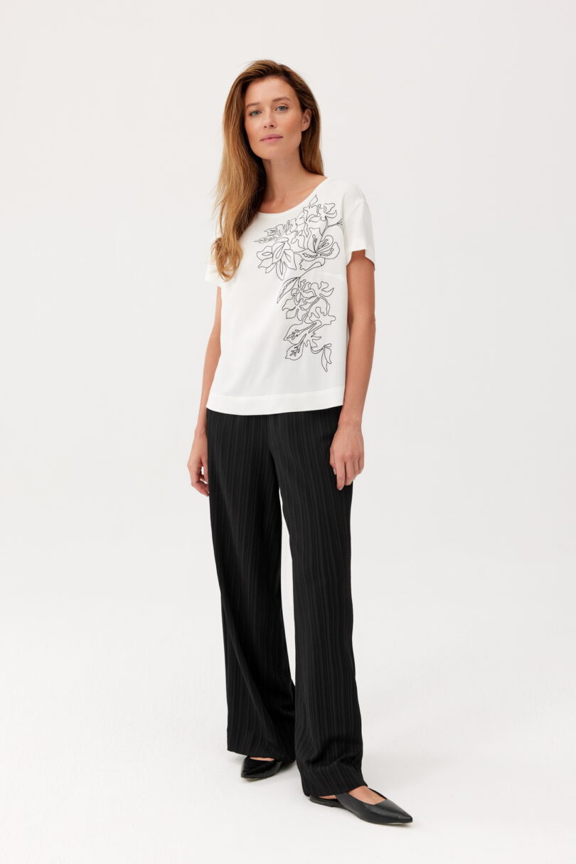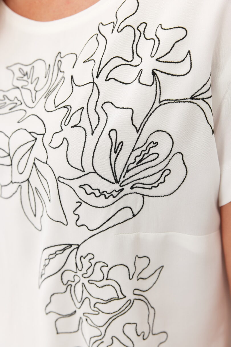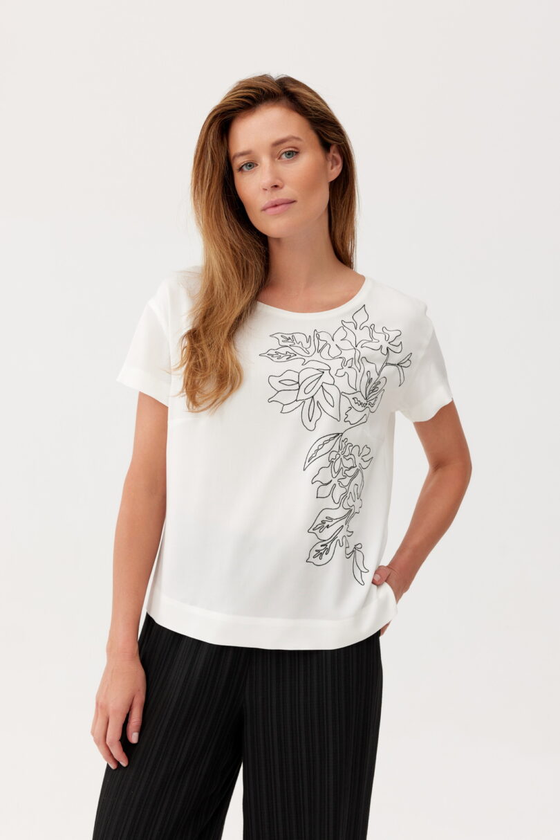 Wykonana ze szlachetnej tkaniny wiskozowej. Krój klasyczny, ponadczasowy. Z przodu kontrastowa haftowana aplikacja.