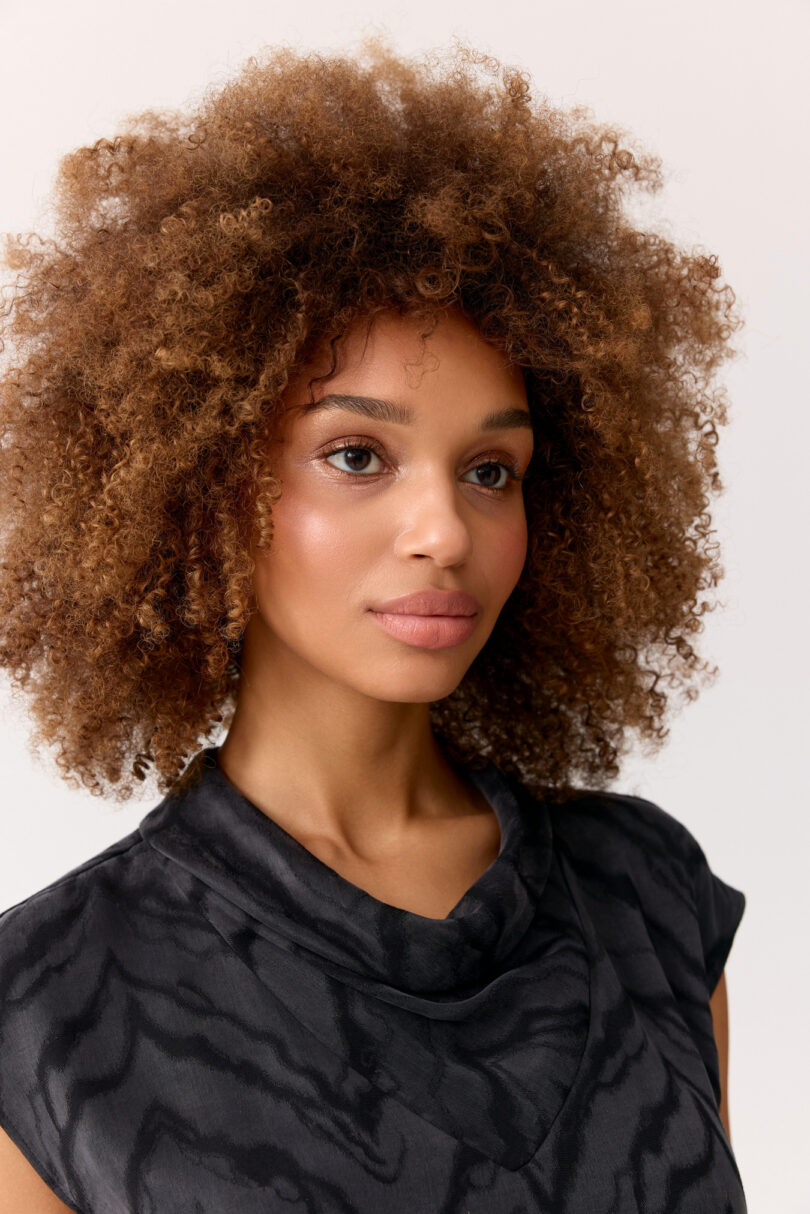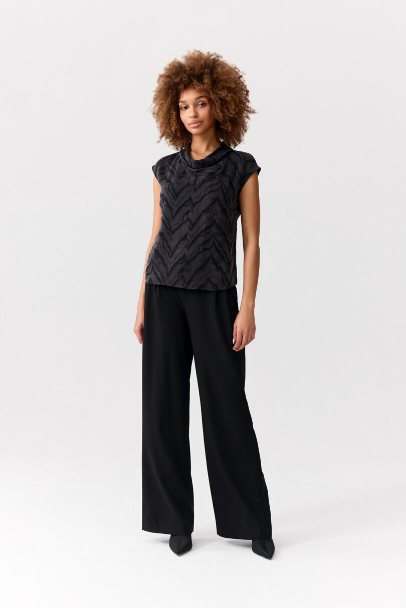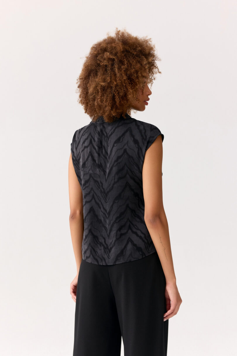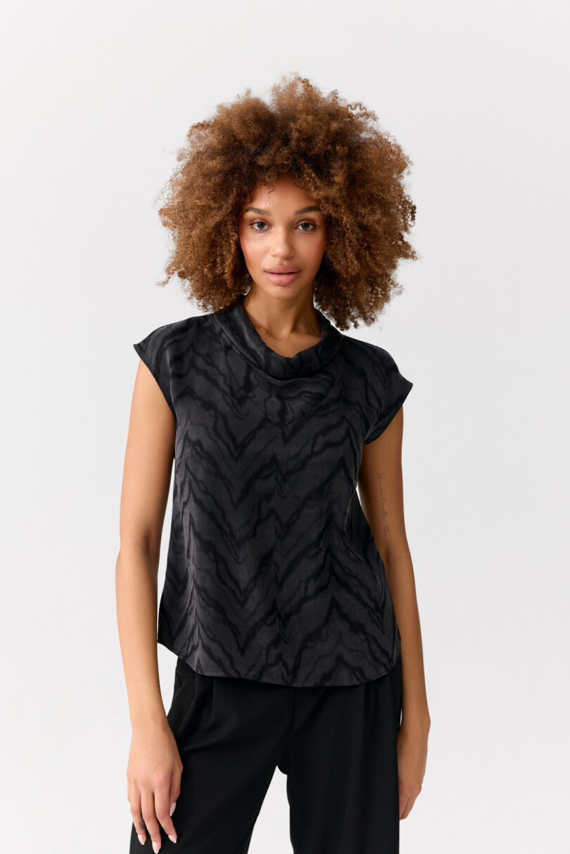 Wykonany z ciemnografitowej tkaniny typu tencel. Krój prosty z subtelnymi pęknięciami po bokach. Dekolt w farmie luźno opadającego golfu.