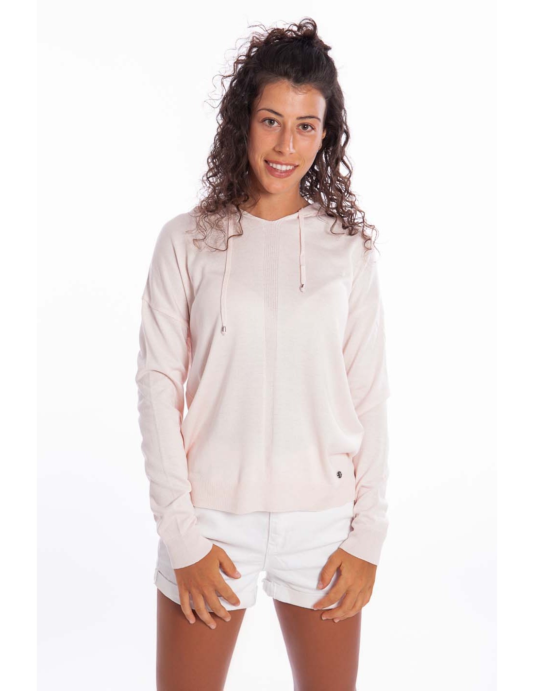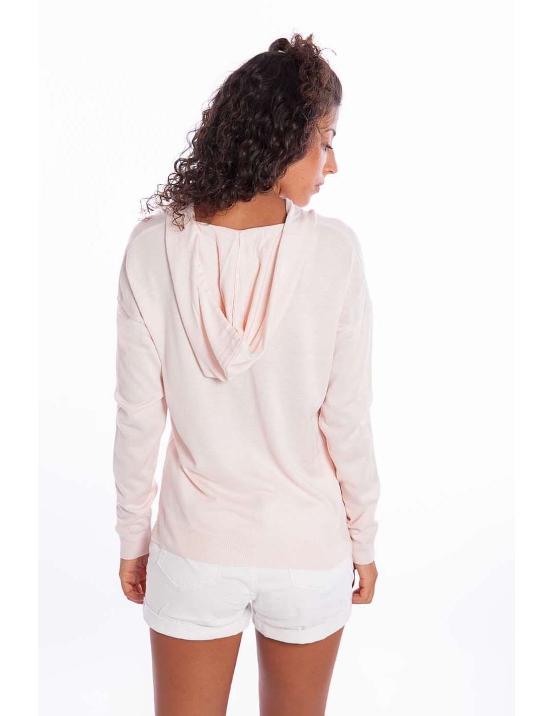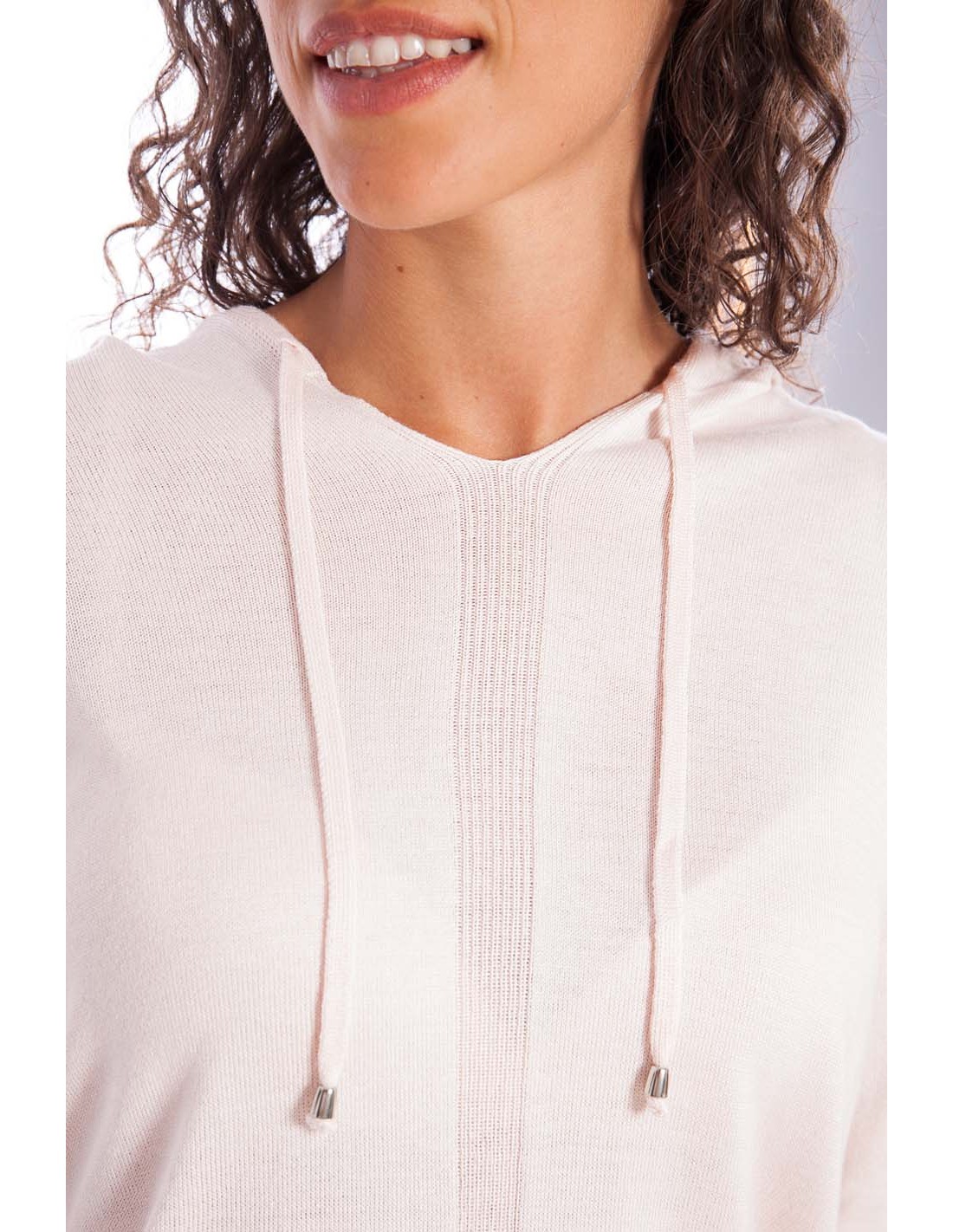 Bardzo delikatna i milutka w dotyku dzianina sprawia, ze bluza w zasadzie nadaje się do noszenia w każdej porze roku. Wykończona u dołu bardzo delikatnym ściągaczem umożliwia noszenie jej na wierzch, jak i wpuszczenie w pasek spodni czy spódnicy. Kaptur nadaje całości lekko sportowego stylu.