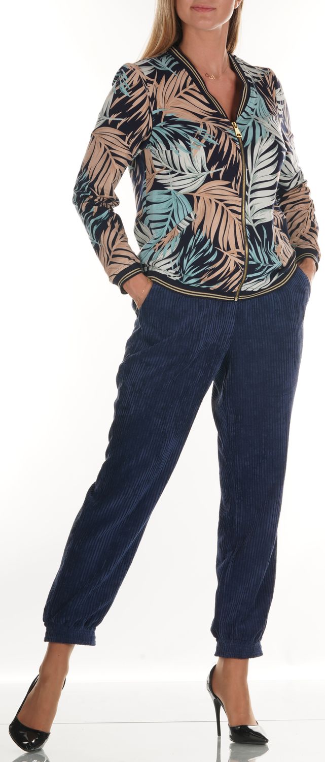 Bluza w typie bomberki we wzory roślinne, wykończona ściągaczem ze złotymi paskami. Zapinana na zamek.