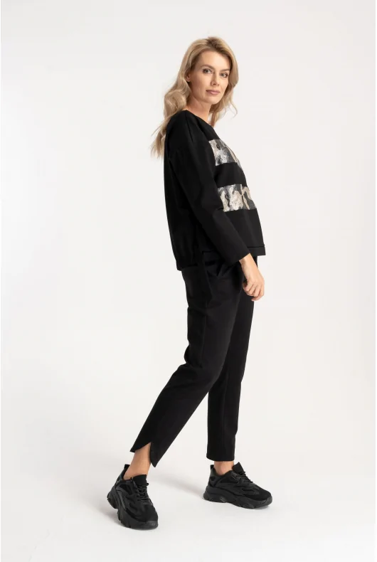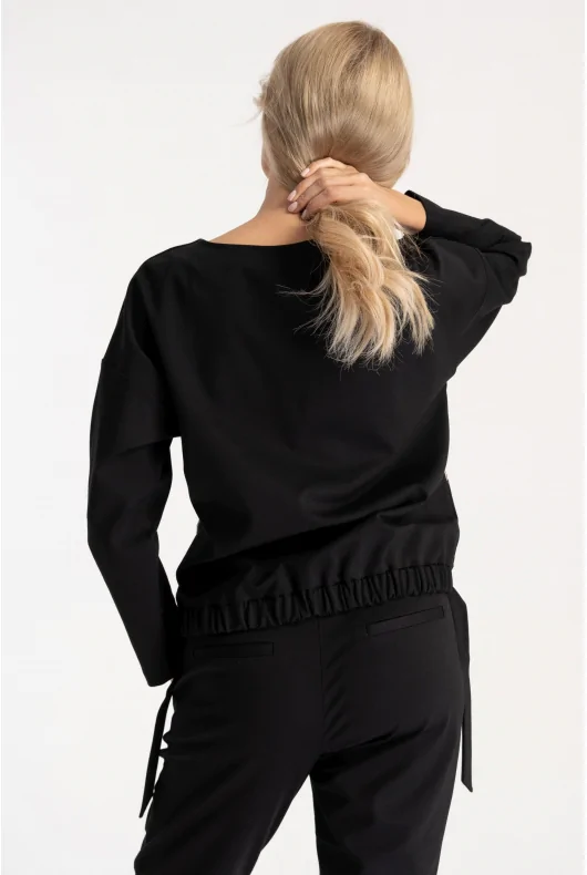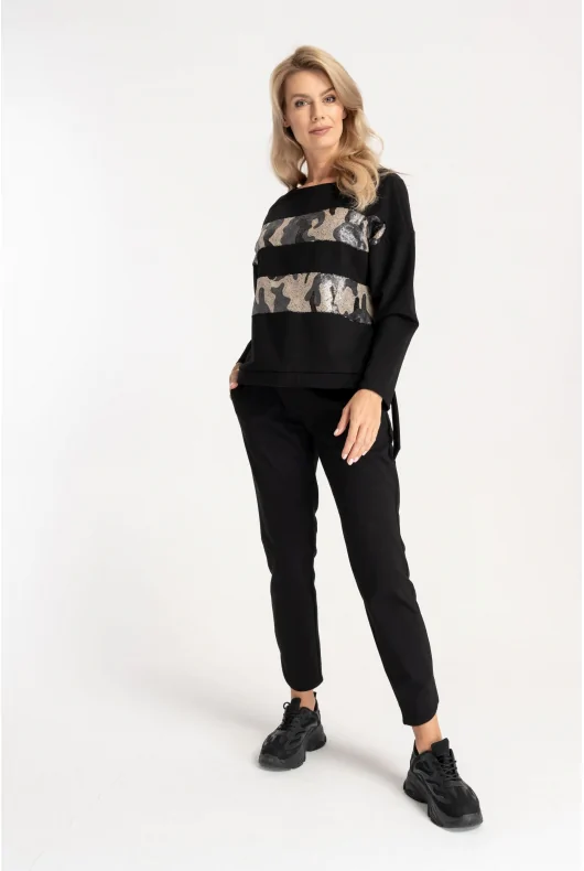 Czarna dzianinowa bluza wkładana przez głowę, z dekoltem w łódkę. Z przodu dwa cekinowe pasy. Na dole wszyta gumka, której końce wystają po obu bokach.