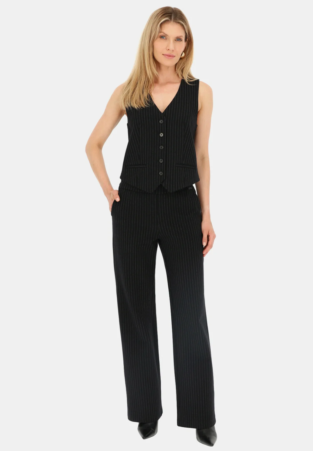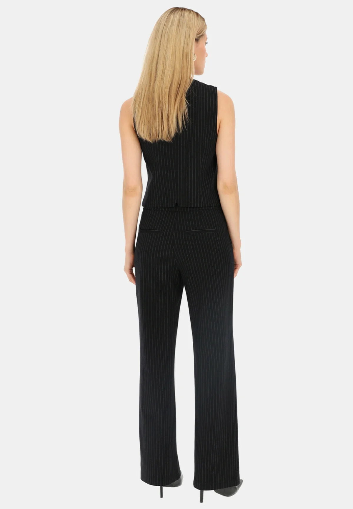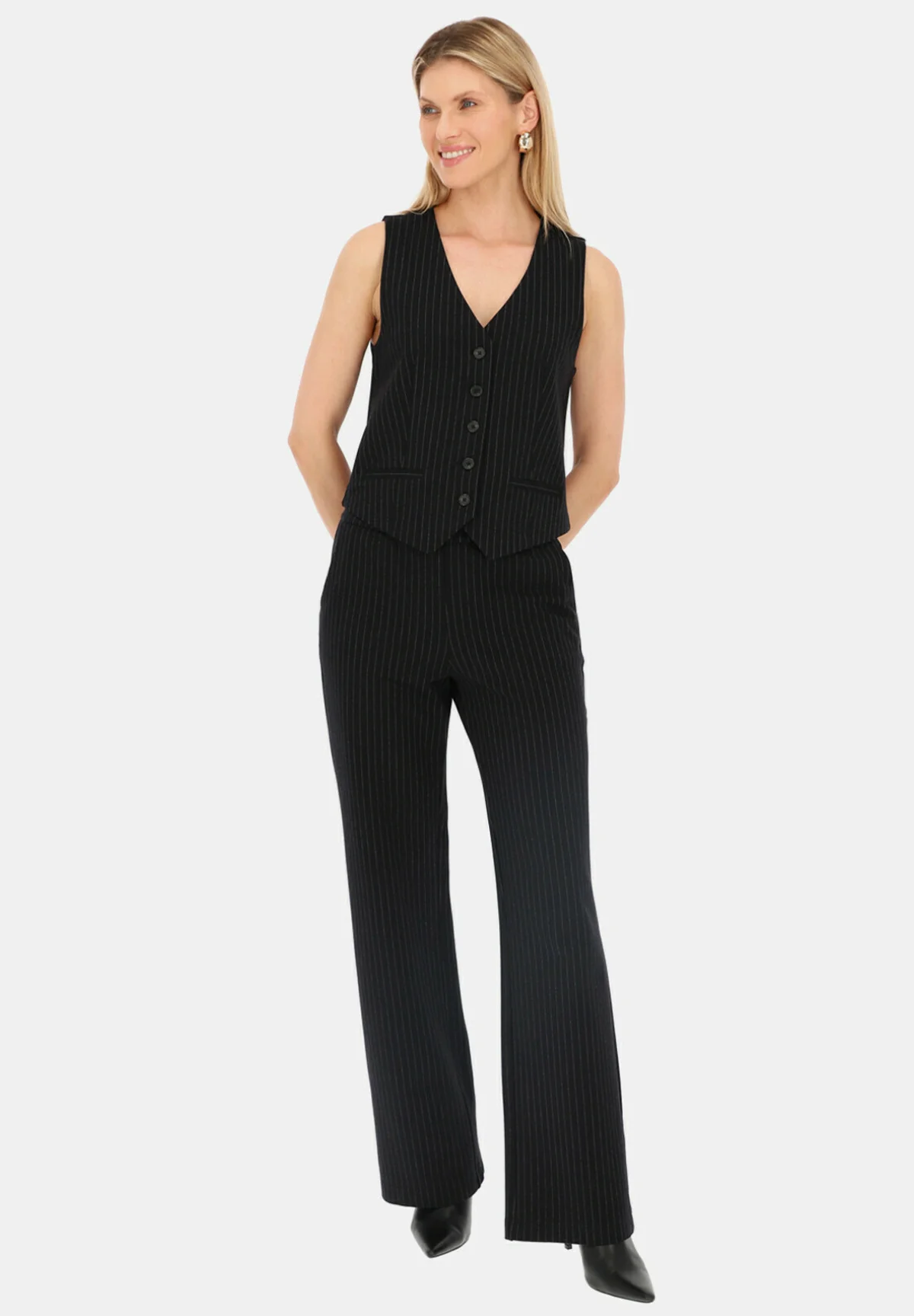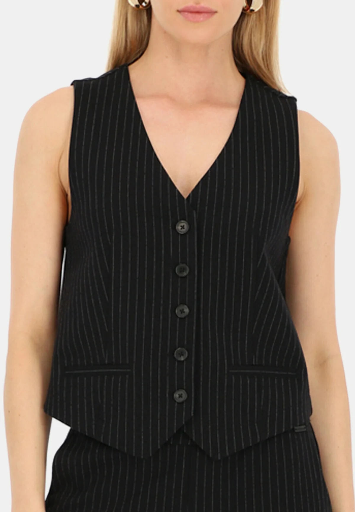 Czarna garniturowa kamizelka w prążek to świetny element kobiecej garderoby. Sprawdzi się idealnie noszona na białą koszulę, solo na gołe ciało oraz jako komplet z żakietem.