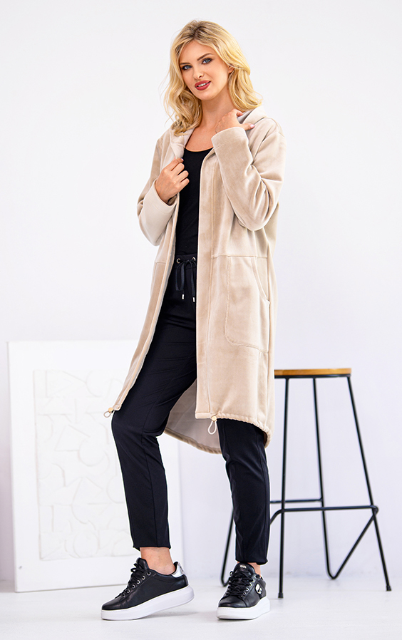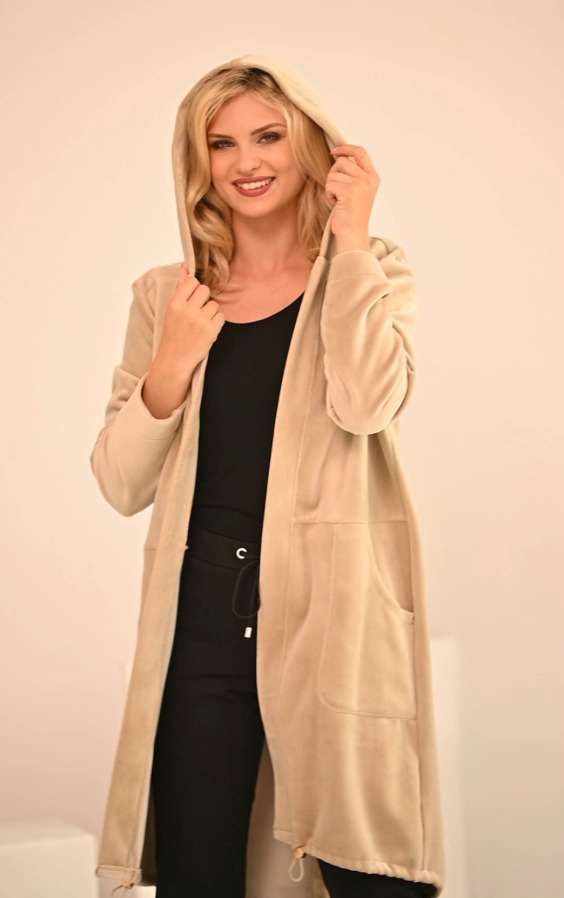 Kardigan Naos uszyty został z wysokiej jakości, dwustronnej dzianiny elastycznej. Zewnętrzna strona przypomina miękki plusz, który jest delikatny i bardzo przyjemny w dotyku, wewnętrzna strona jest gładka. Kardigan Naos posiada kaptur i dwie kieszenie z przodu. Dół jest ściągany za pomocą gumeczek ze złotymi stoperami. Z tyłu znajduje się ozdobne, trójkątne wycięcie na dole. Fason swobodny, prosty, niezapinany.