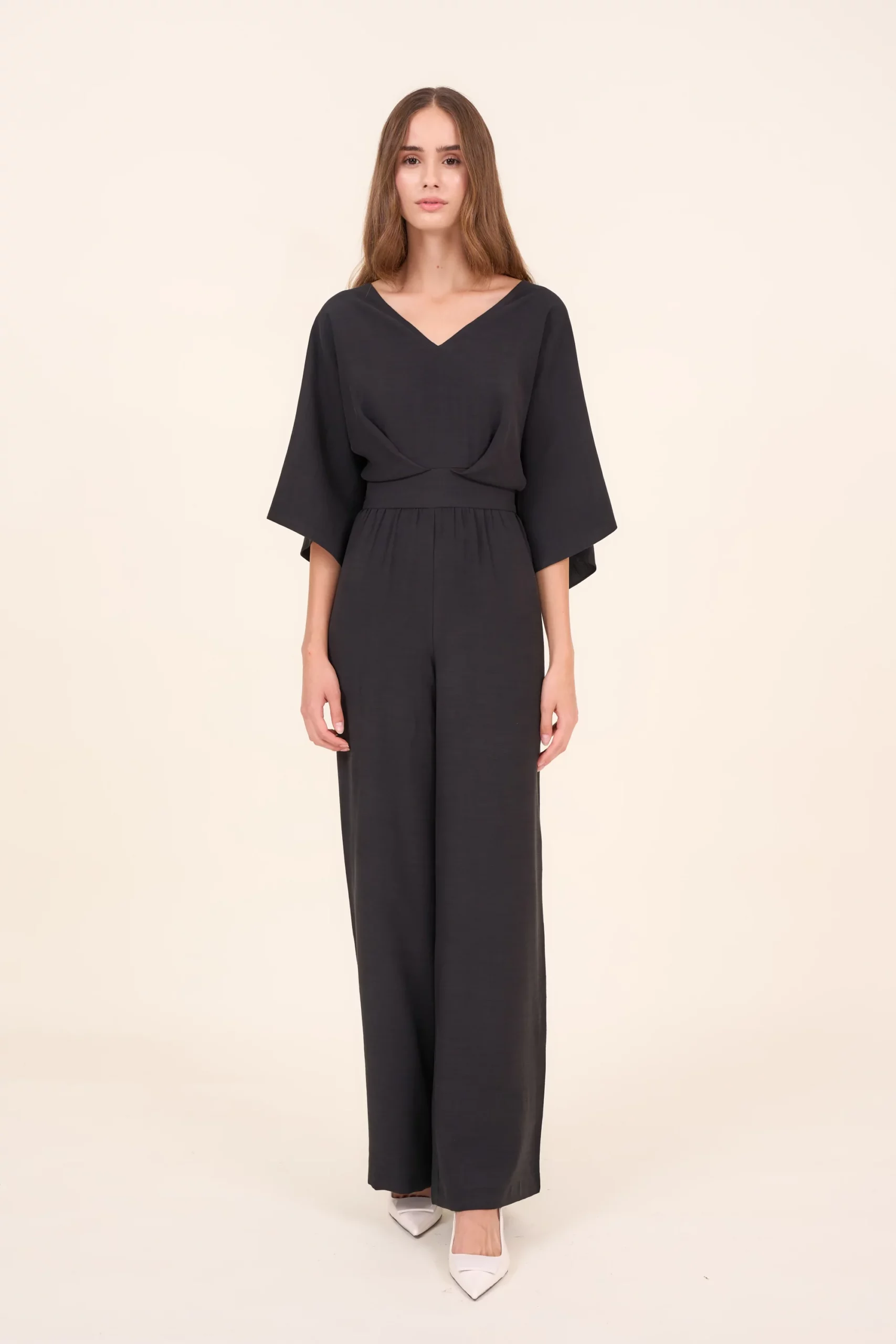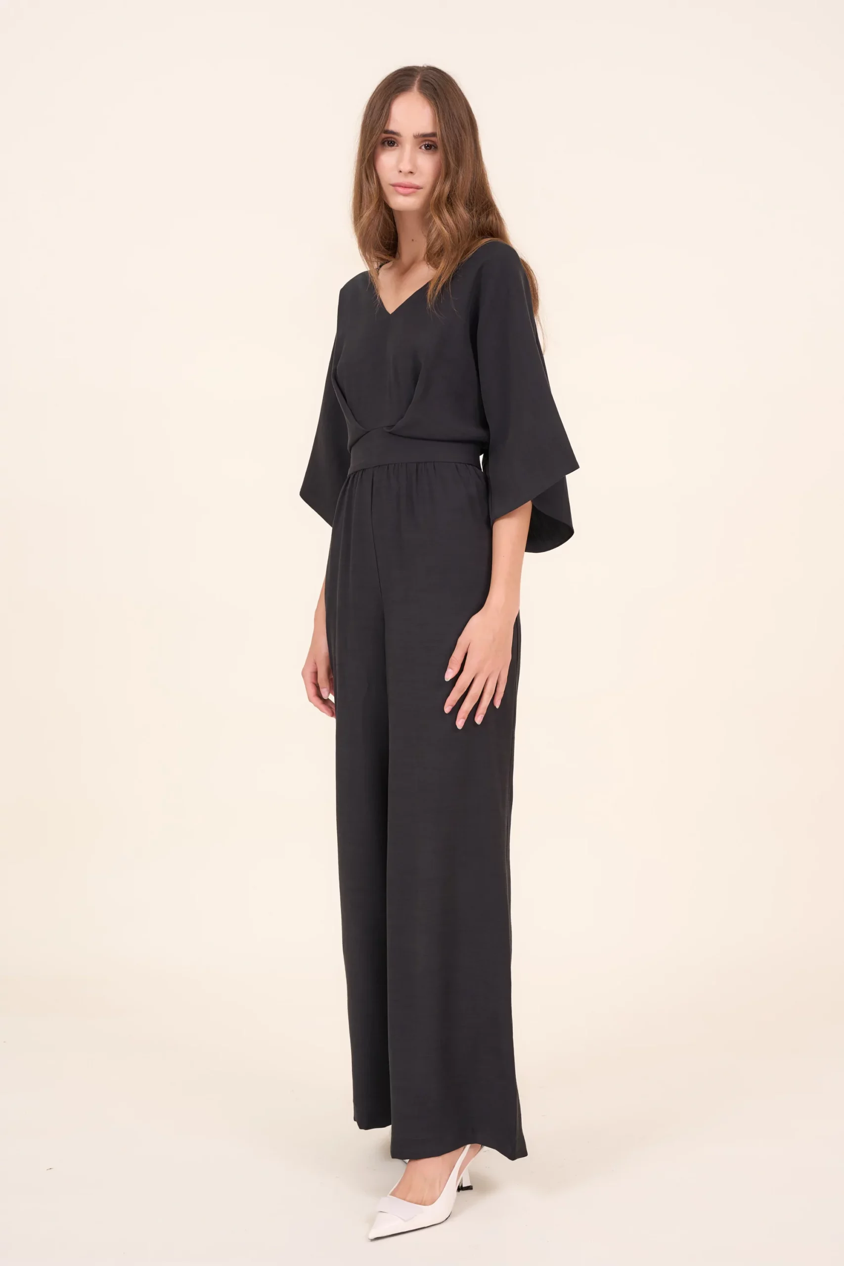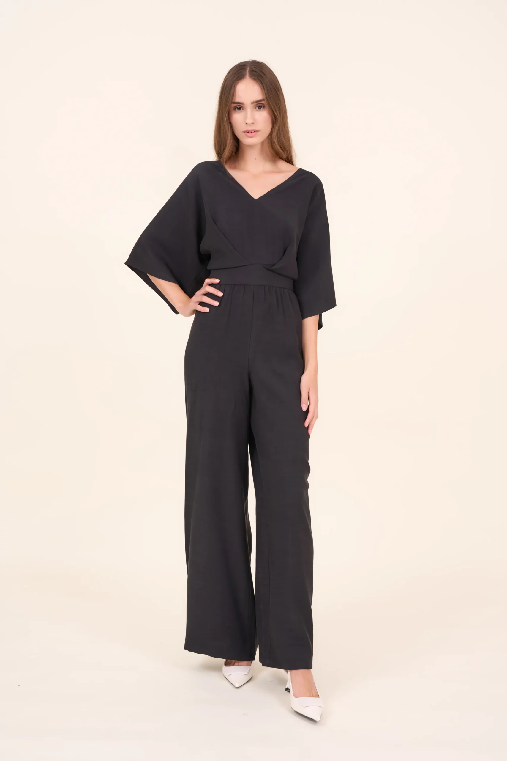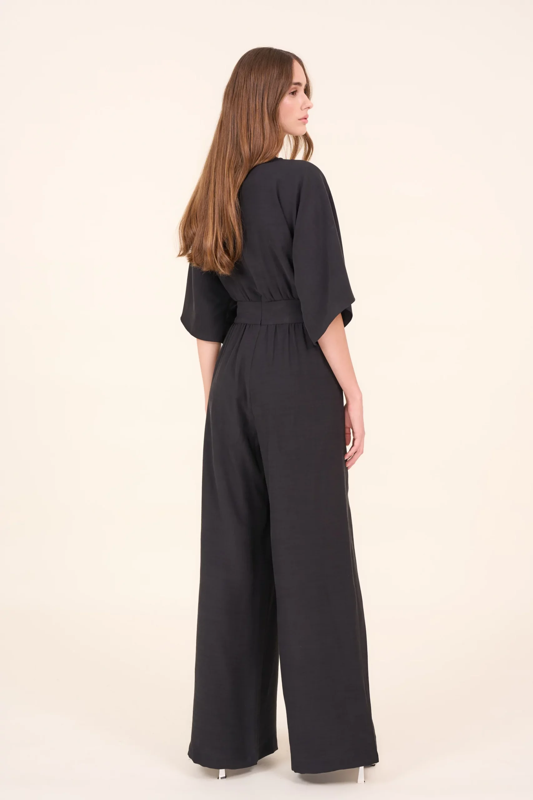 Przewiewny kombinezon damski o luźnym kroju z szerokimi długimi nogawkami i rękawami do łokcia. Posiada dekolt w kształcie V oraz dwie ozdobne zakładki z przodu. Z tyłu poprowadzone jest, od góry przez całe plecy, zapięcie na ukryty zamek. Talie podkreśla wszyty pasek. Kombinezon doskonale nadaje się na co dzień ale także jako strój na bardziej eleganckie okazje.