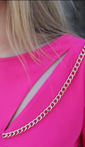 1) bluzki z rozcięciami i ozdobnym łańcuszkiem. Bluzka jest dłuższa, zakończona tunelem z gumą, dzięki czemu ładnie się bluzuje i ukrywa drobne mankamenty.