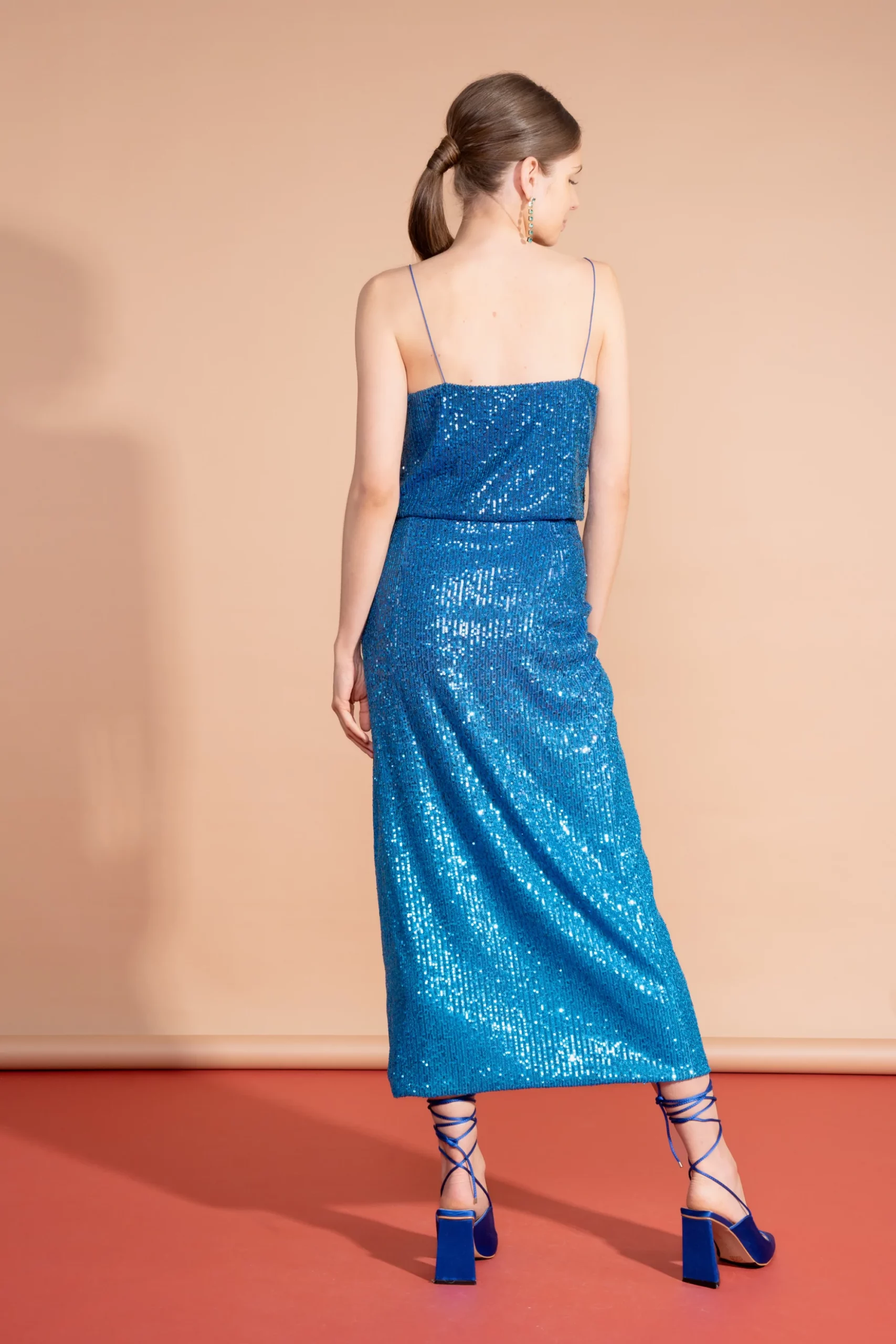 Wykonany z niebieskiej tkaniny z lekkim efektem ombre. Krótki top o luźnym kroju na cienkich ramiączkach. Spódnica średniej długości z rozcięciem z przodu. Z boku zasuwana na kryty suwak. Podszewka w kolorze jasno beżowym.