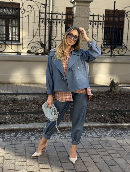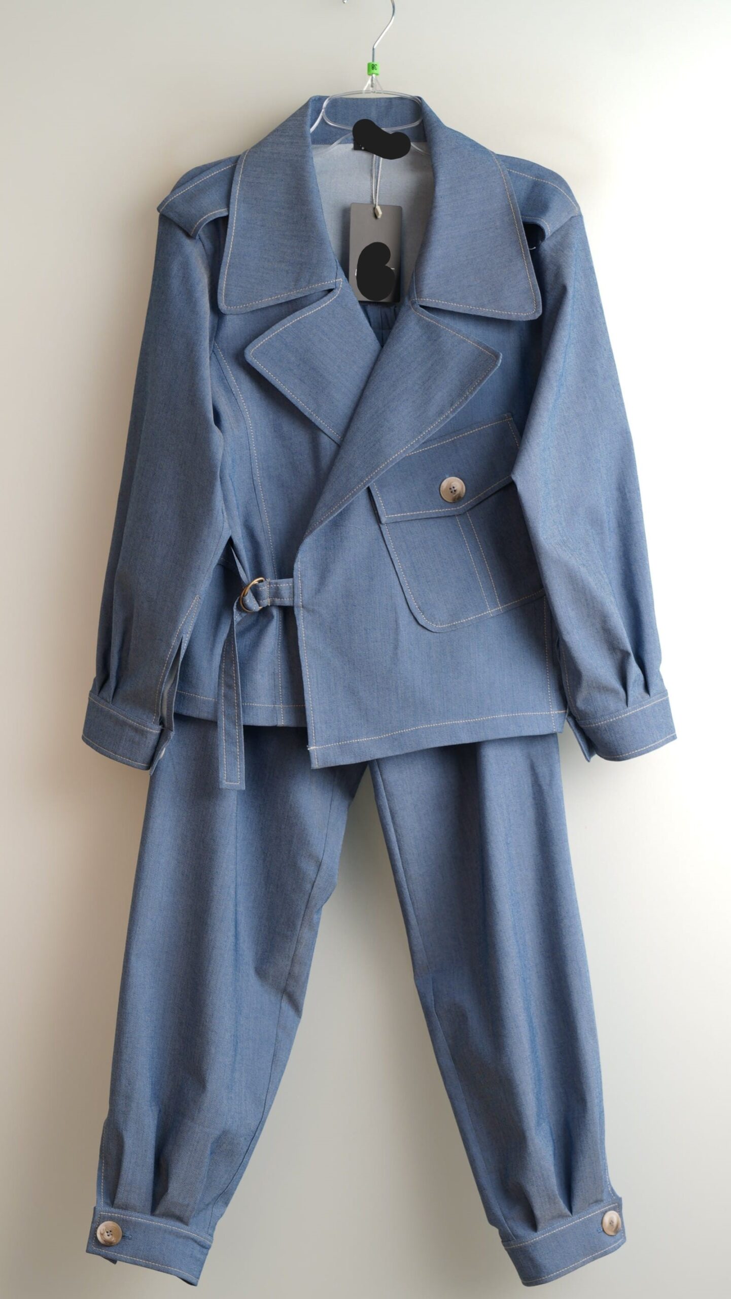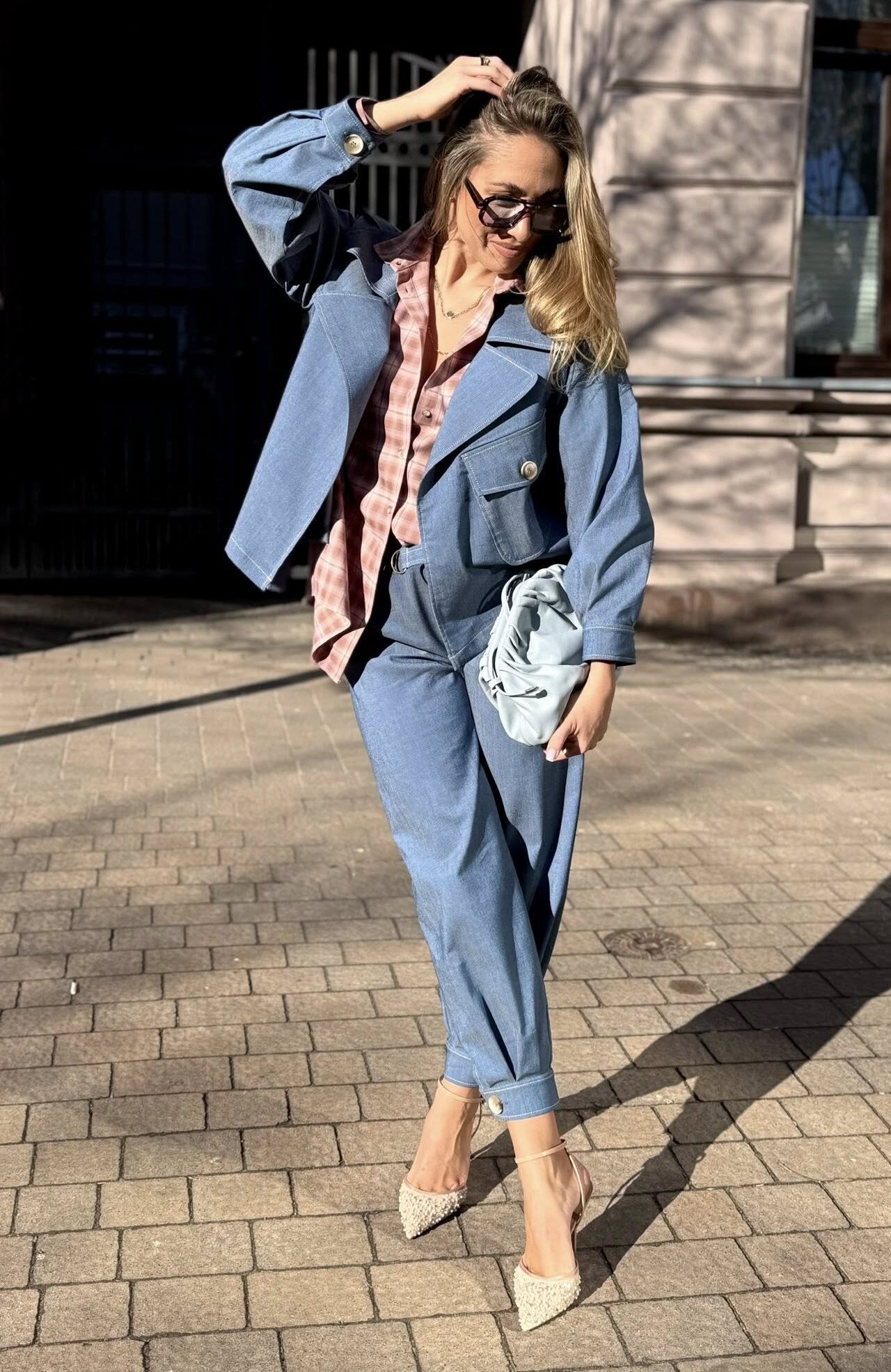 Stylowy komplet w modnym, jeansowym odcieniu to idealna propozycja dla kobiet ceniących nowoczesny design i wygodę. Zestaw składa się z efektownej kurtki o krótszym kroju oraz spodni o swobodnym fasonie, które razem tworzą spójną i modną stylizację.