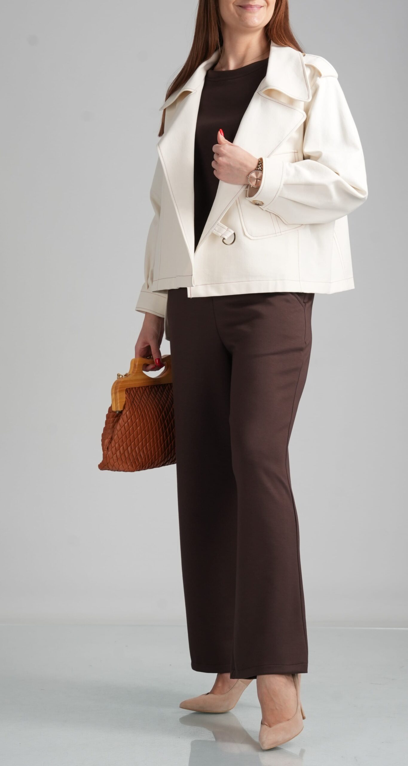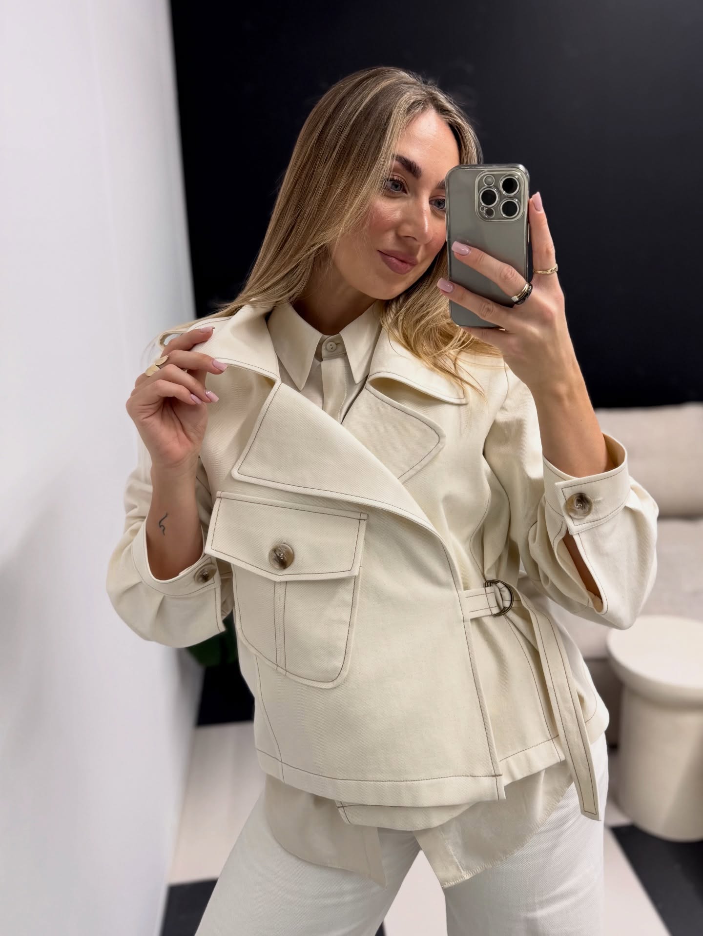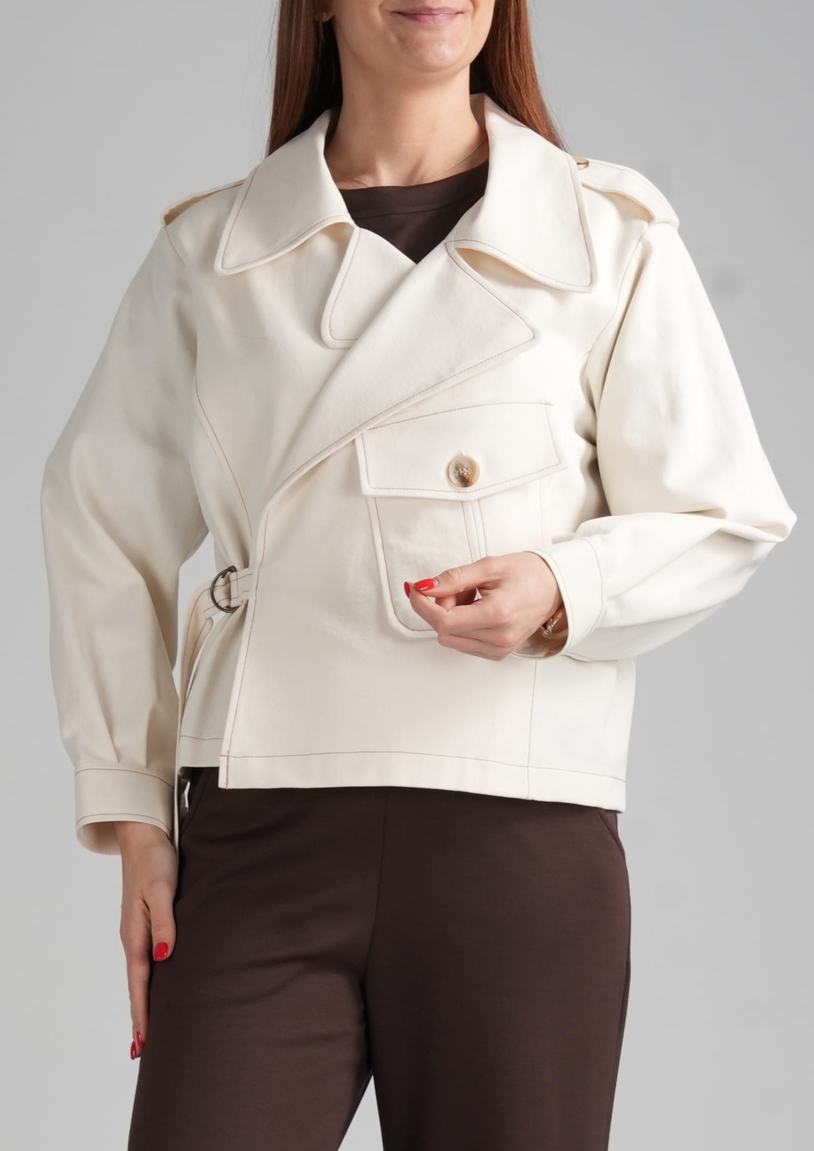 Kurtka wyróżnia się szerokim kołnierzem, asymetrycznym zapięciem oraz ozdobnym paskiem z klamrą, który podkreśla talię. Kontrastowe brązowe stębnówki dodają całości charakteru i podkreślają konstrukcję modelu. Tył kurtki jest gładki, z pionowym szwem, który zapewnia lekkie dopasowanie do sylwetki.