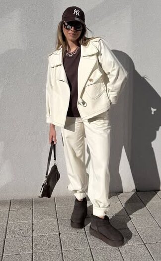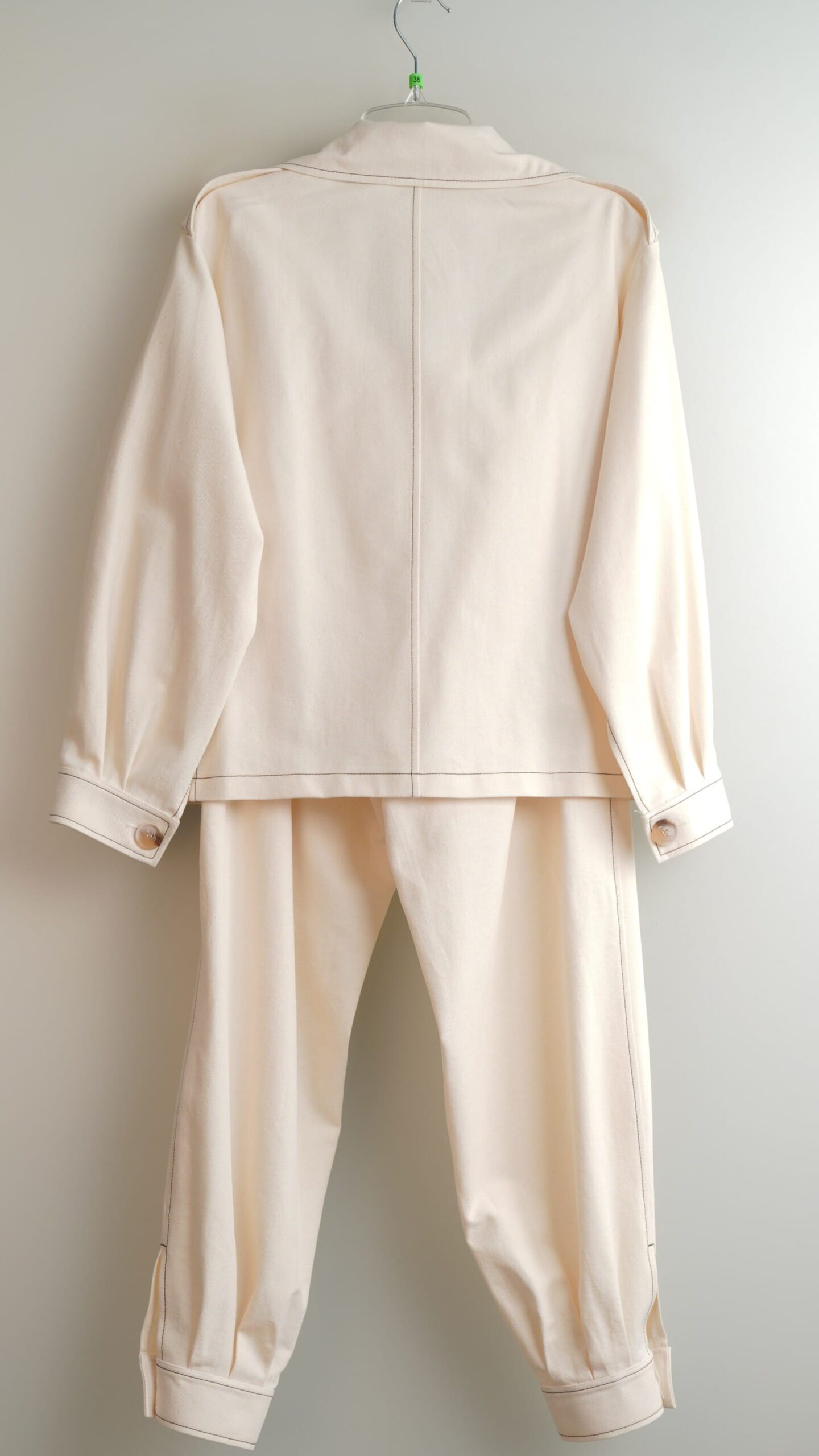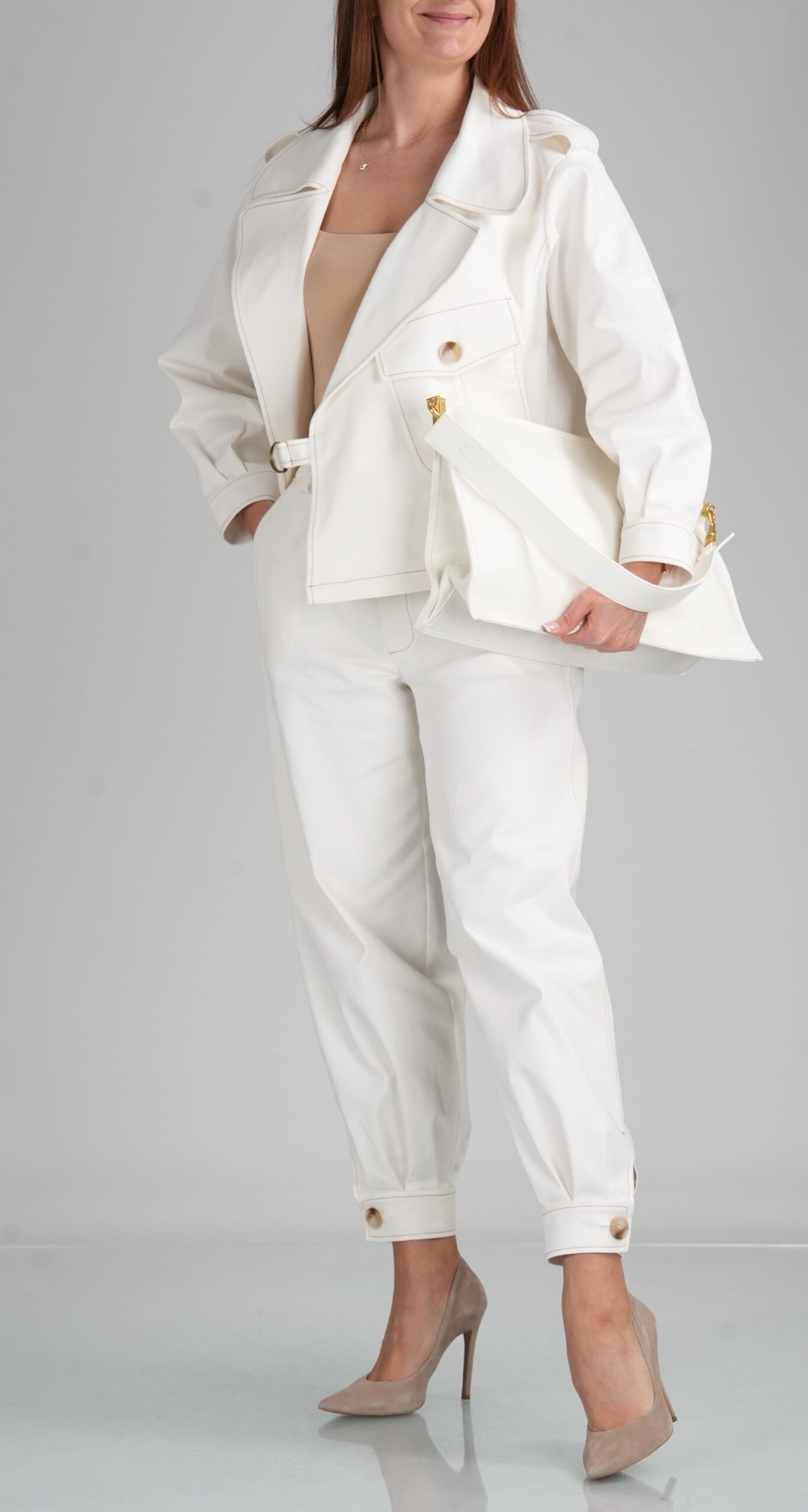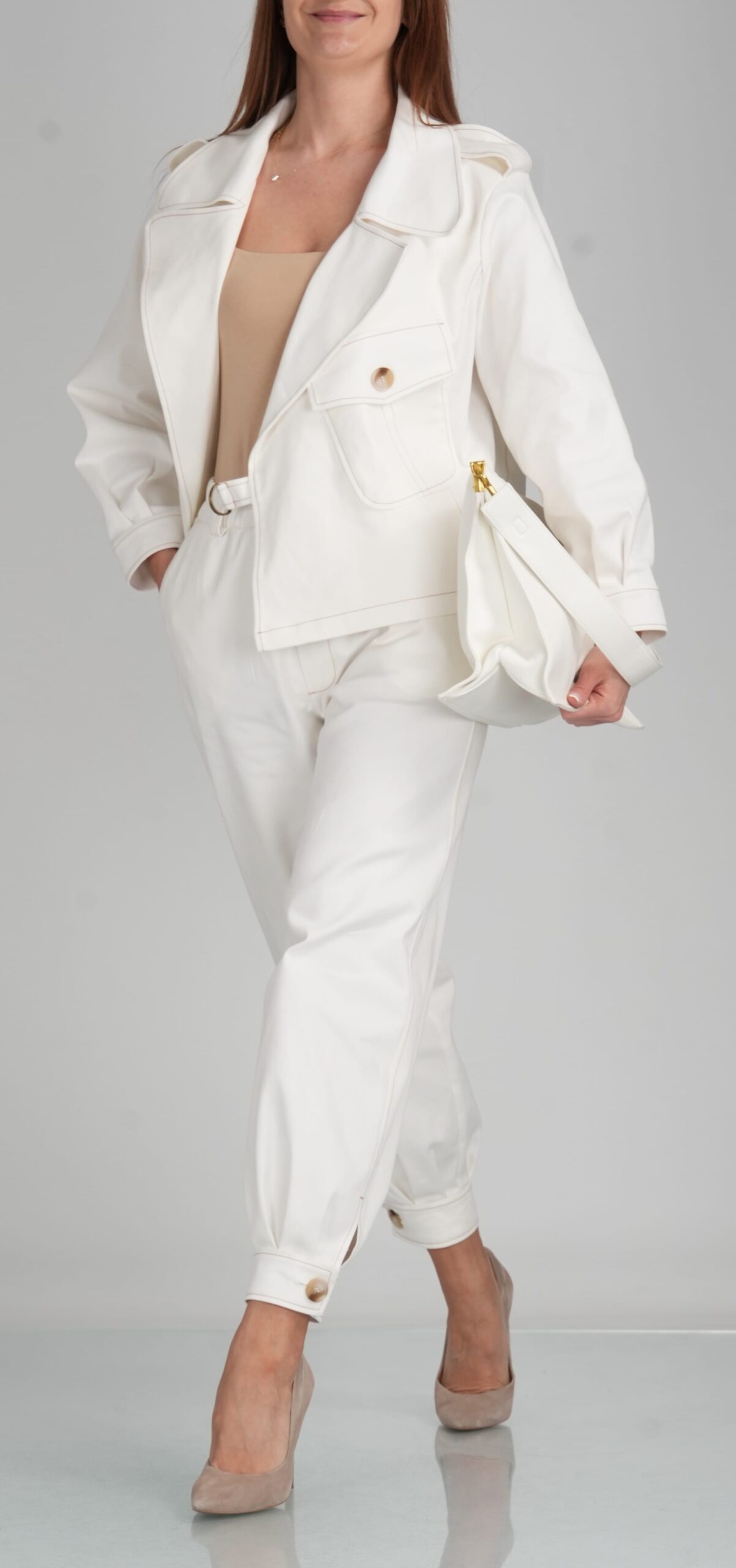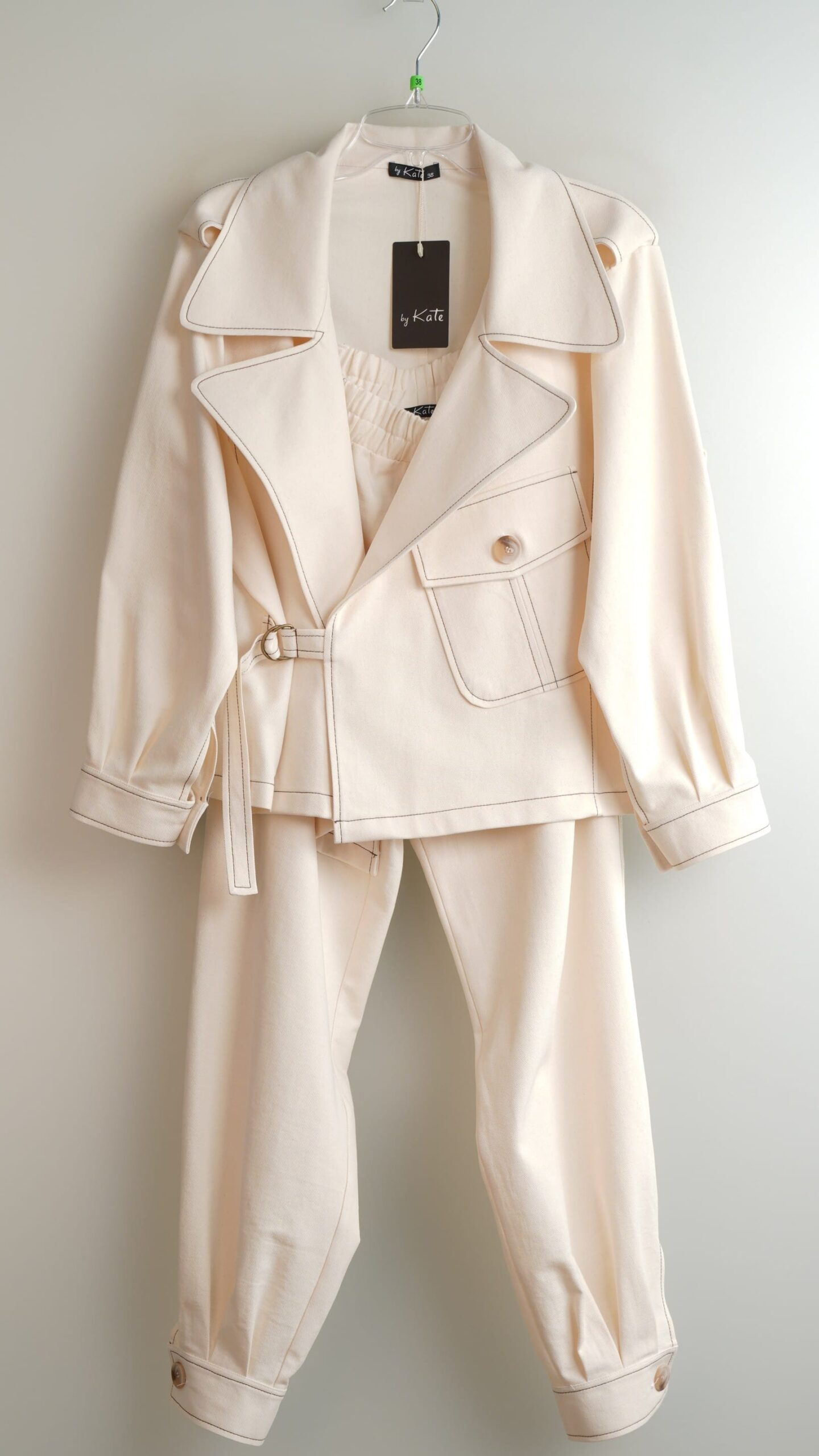 Stylowy komplet w modnym, kremowym odcieniu to idealna propozycja dla kobiet ceniących nowoczesny design i wygodę. Zestaw składa się z efektownej kurtki o krótszym kroju oraz spodni o swobodnym fasonie, które razem tworzą spójną i modną stylizację.
