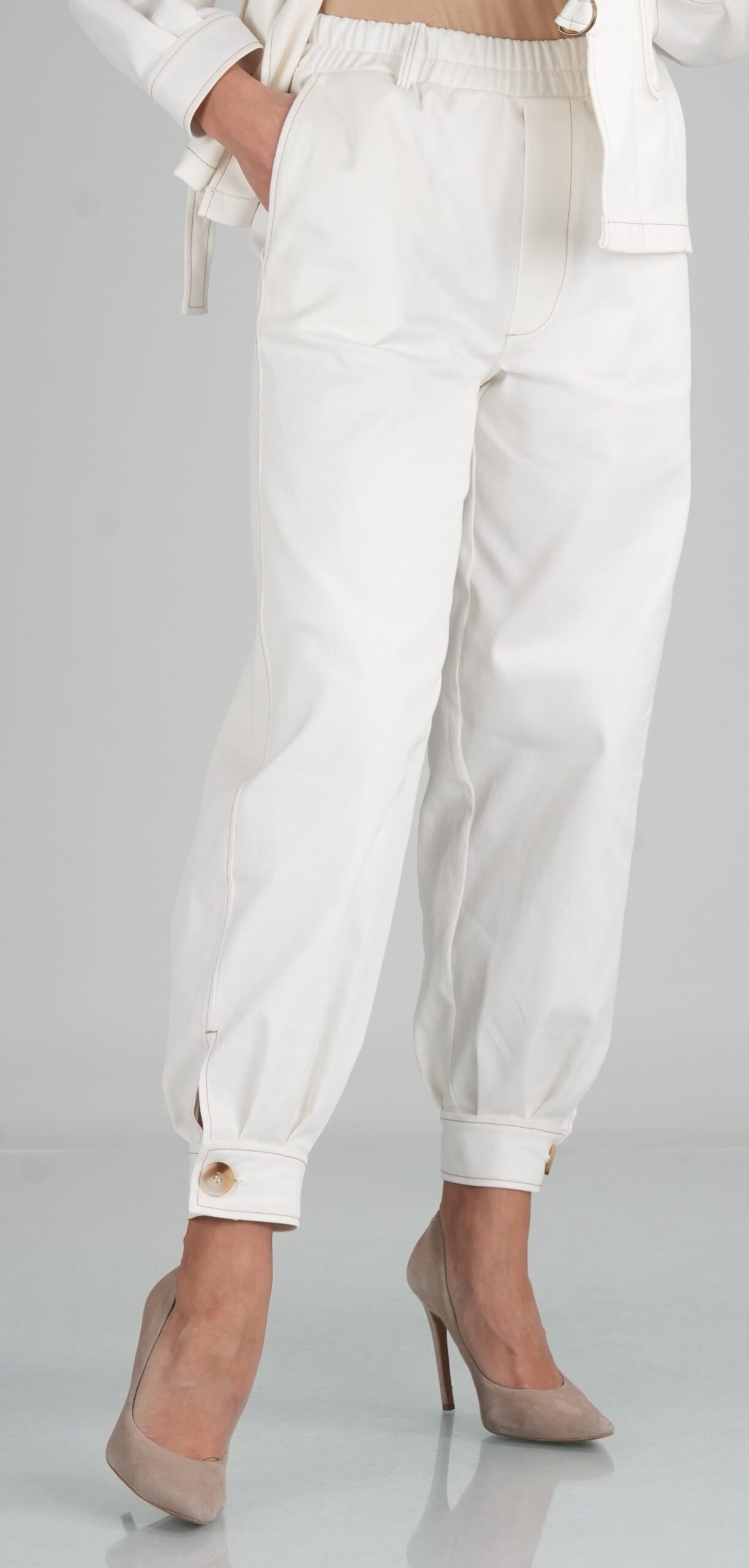 Spodnie mają luźniejszy, nowoczesny krój z delikatnym zwężeniem przy kostkach oraz mankietami zapinanymi na guziki, co nadaje im modnego, lekko balonowego charakteru.