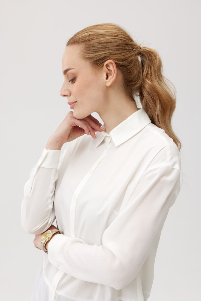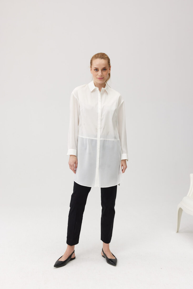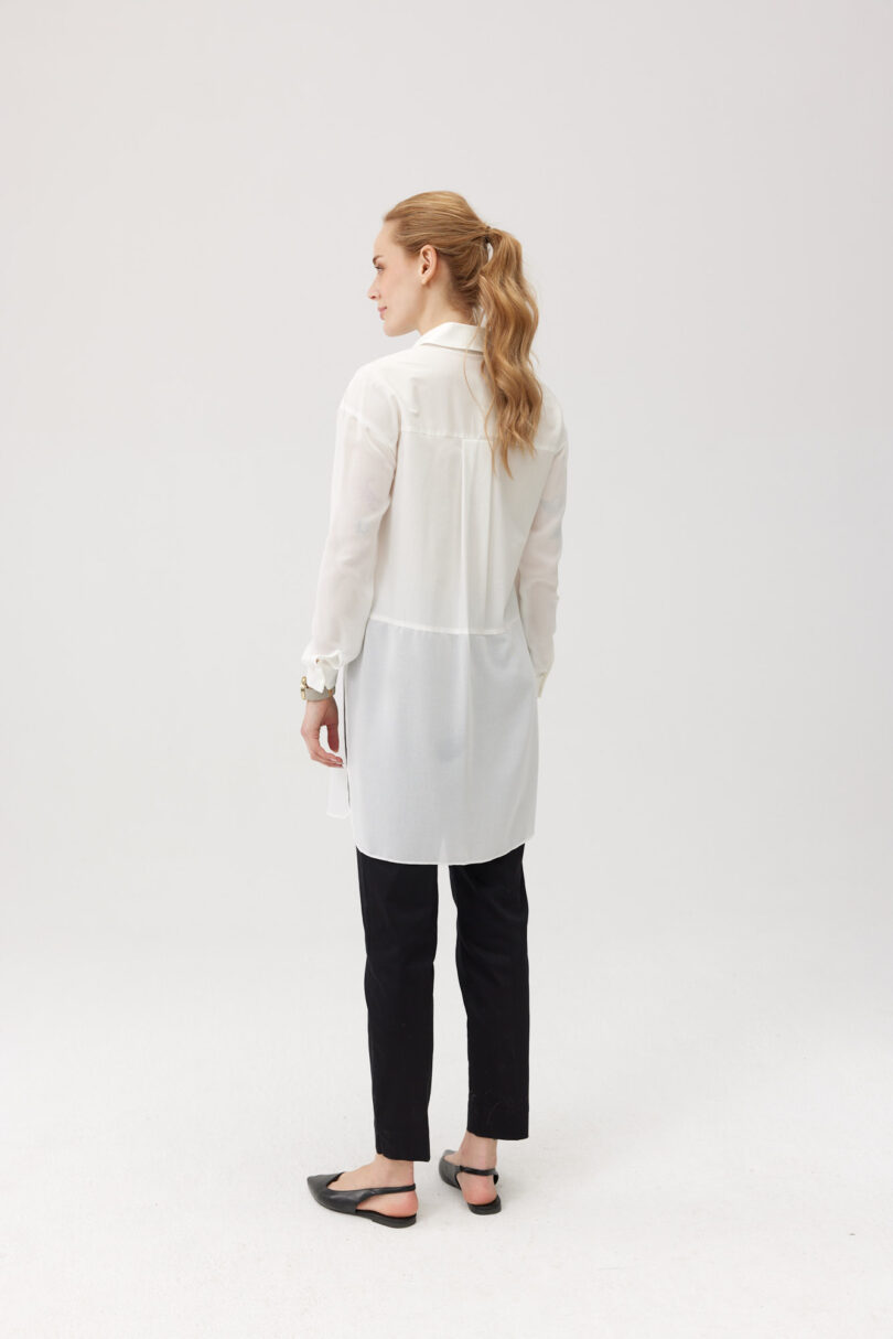 Subtelnej elegancji dodają szyfonowe rękawy oraz dolna część bluzki.