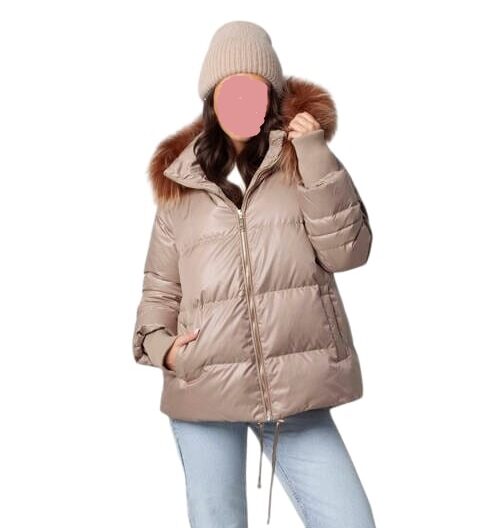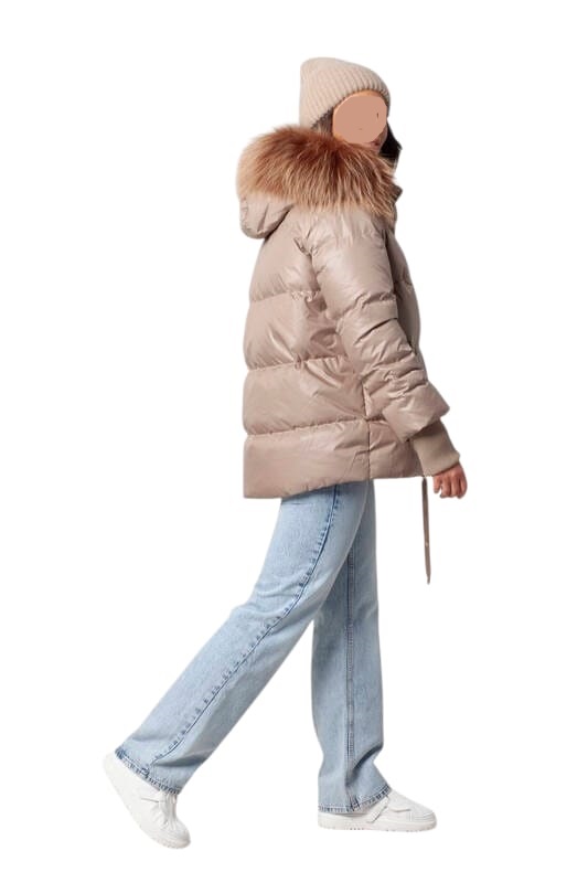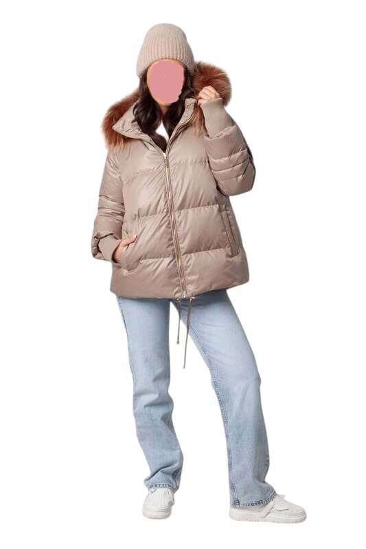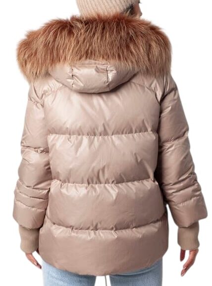 Krótka kurtka wypełniona naturalnym puchem kaczym z kapturem obszytym naturalnym futrem. Idealna propozycja na zimę, lekka a zarazem ciepła. Uszyta w Polsce.
