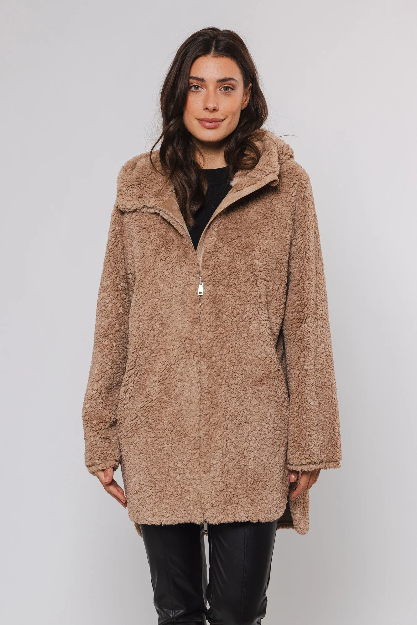 Płaszcz oferuje dwa wyjątkowe wyglądy w jednym. Strona ze sztucznego futra doda Ci odrobinę luksusu, podczas gdy strona ze sztucznego zamszu zapewnia bardziej swobodną, a jednocześnie stylową opcję.