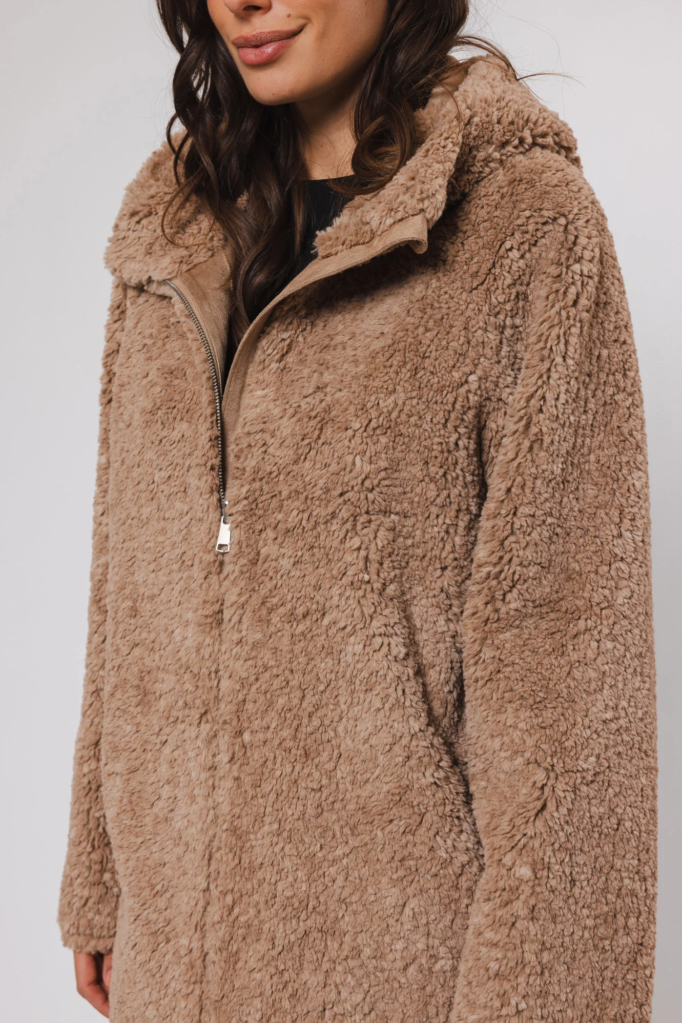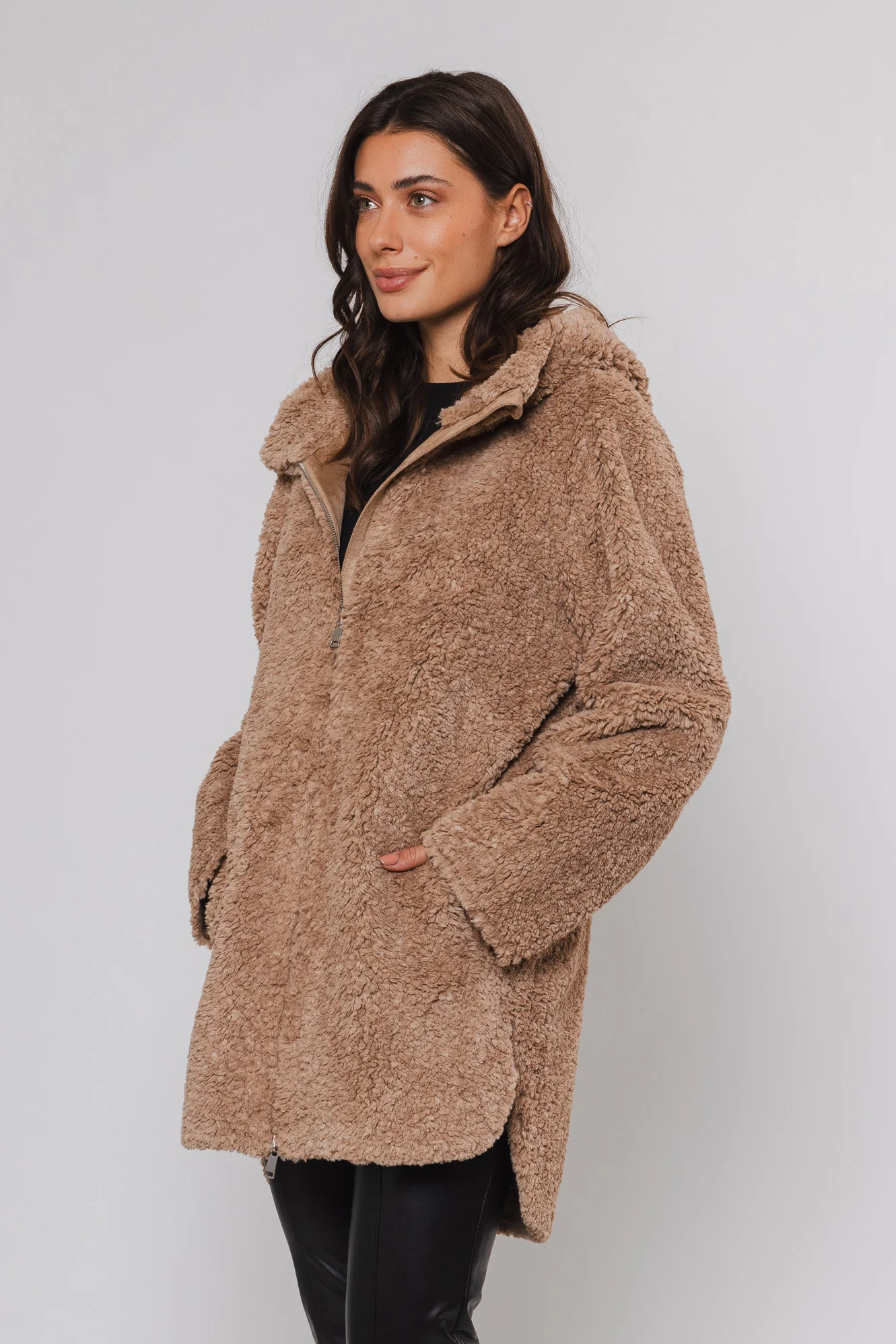Wykonany z najmiększych materiałów, ten płaszcz oferuje dwa wyjątkowe wyglądy w jednym. Strona ze sztucznego futra jest idealna, aby dodać odrobinę luksusu, podczas gdy strona ze sztucznego zamszu zapewnia bardziej swobodną, a jednocześnie stylową opcję. Ma ukryte zapięcie na zamek błyskawiczny i boczne kieszenie. Niezależnie od tego, czy zestawisz ten płaszcz ze spodniami i butami, czy też dobierzesz do niego szpilki, z pewnością poczujesz się pewnie i komfortowo.”