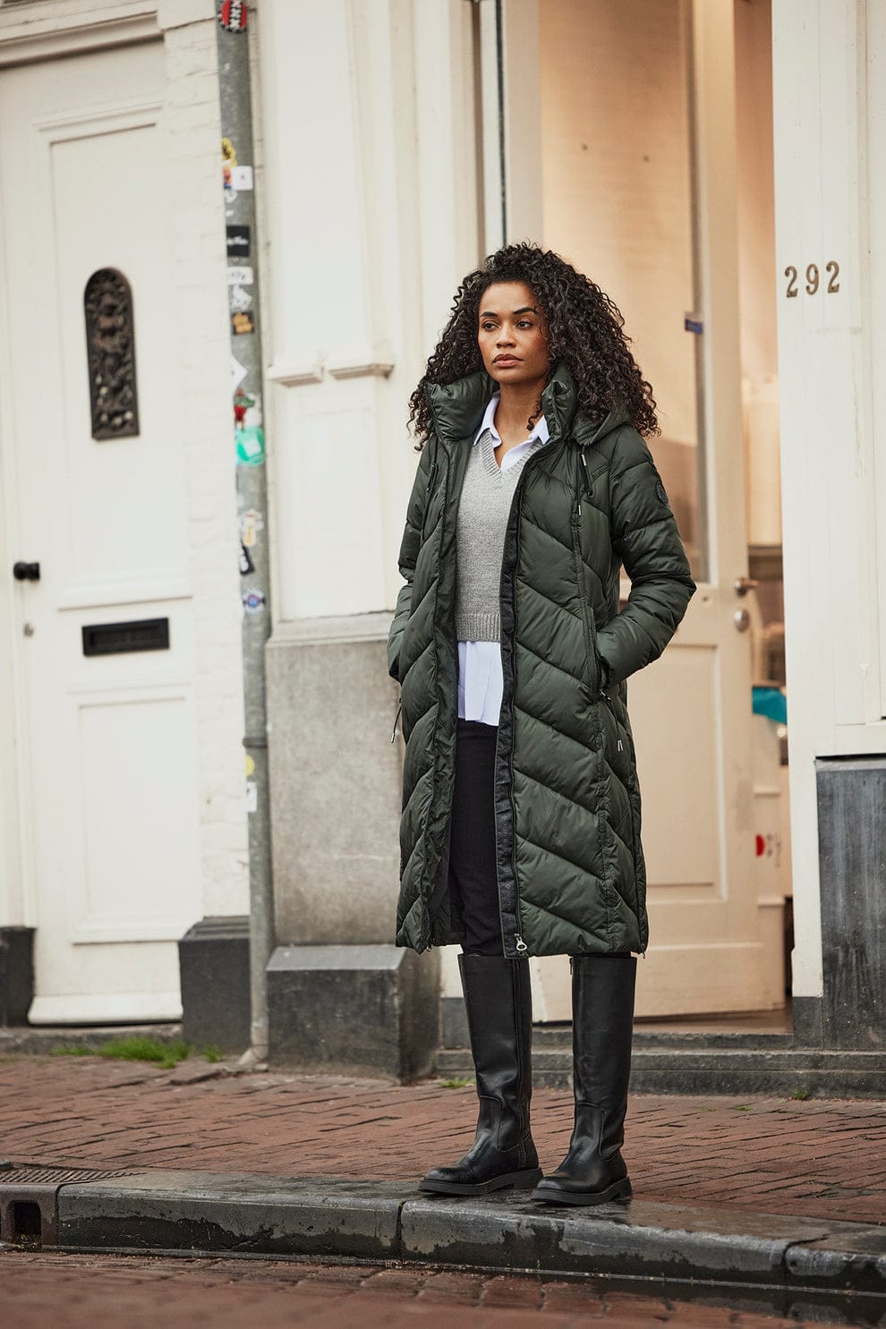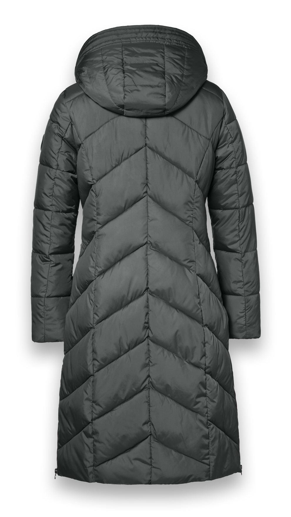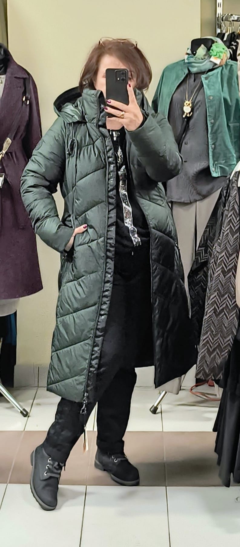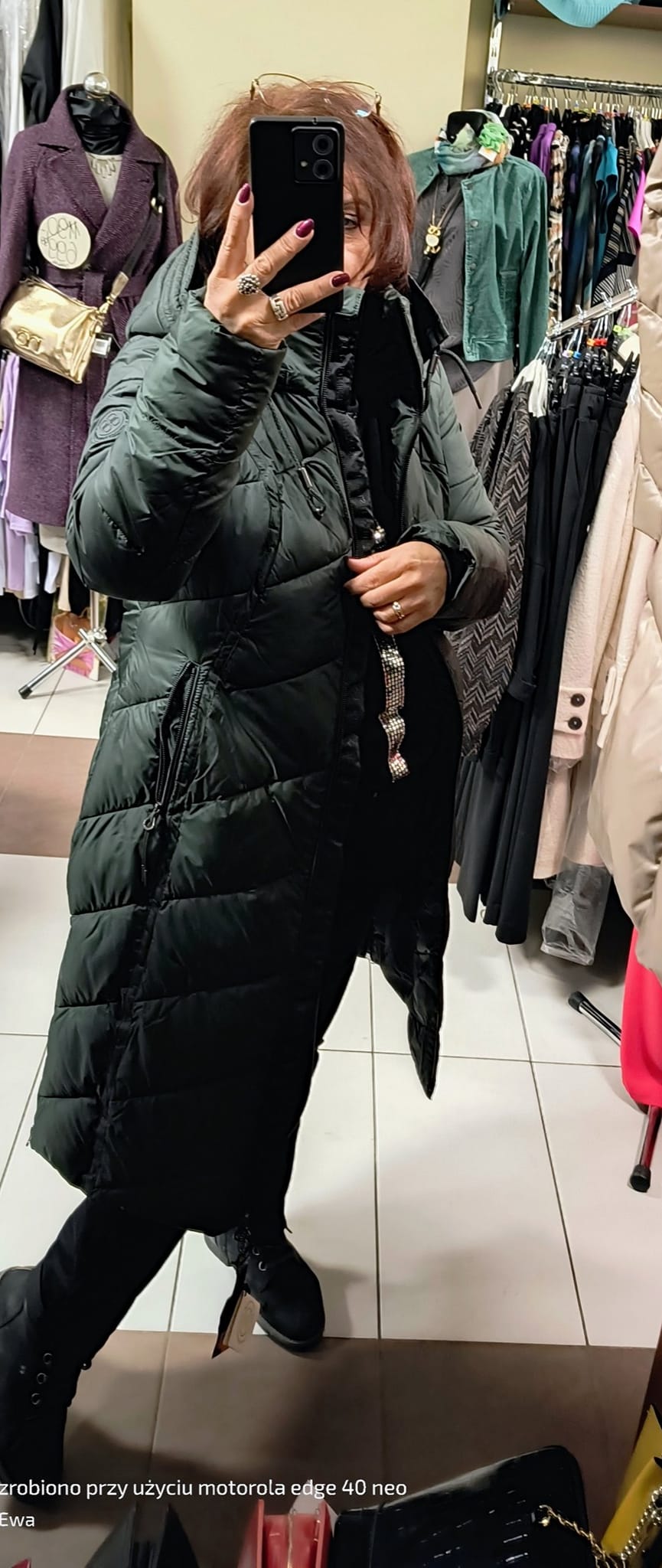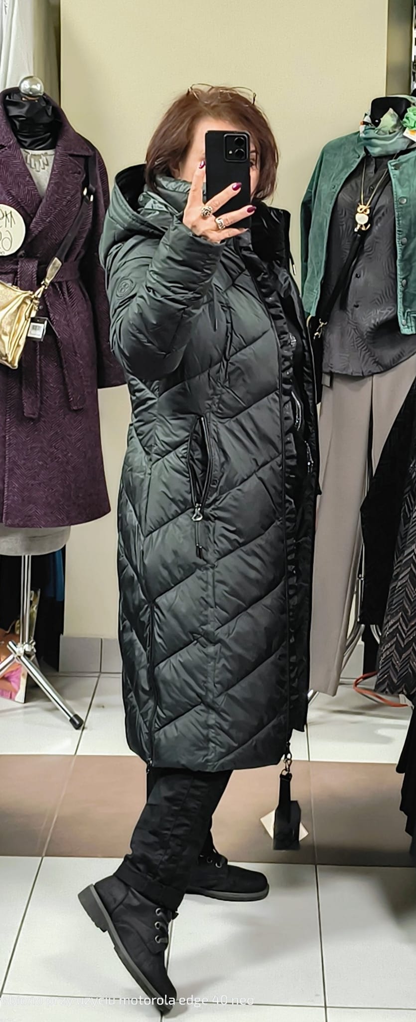 Zimowa, pikowana kurtka długości za kolano. Tkanina wierzchnia impregnowana, z lekkim połyskiem Zapinana na expres, po bokach dwie kieszenie również zapinane na expresy. Odpinany kaptur, na dole po bokach dwa rozporki zapinane na suwaki.