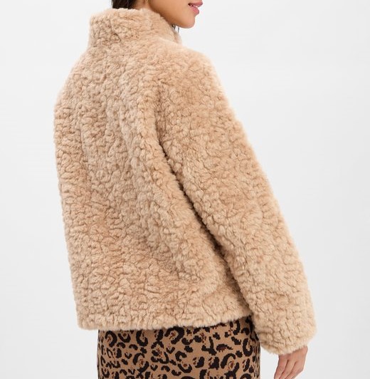 Modna krótka kurtka wykonana z przytulnego sztucznego futra stanowi modny dodatek do jeansów.