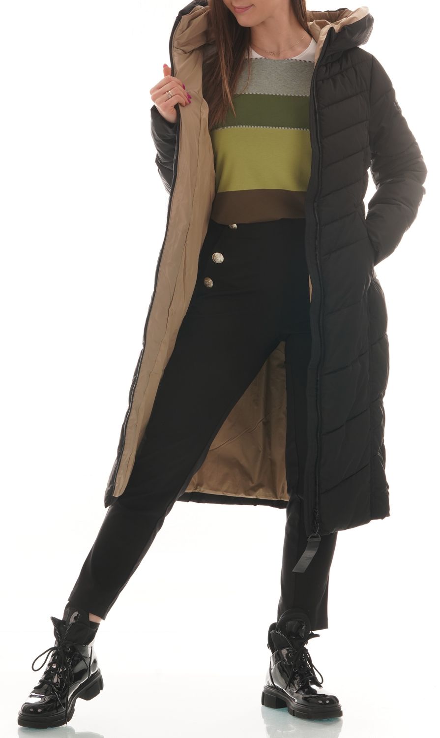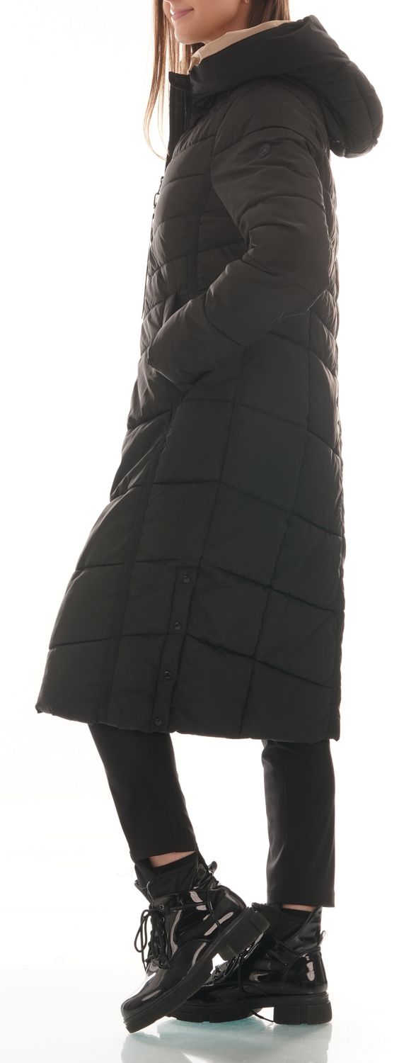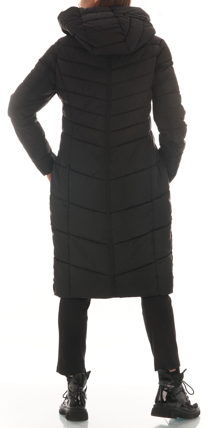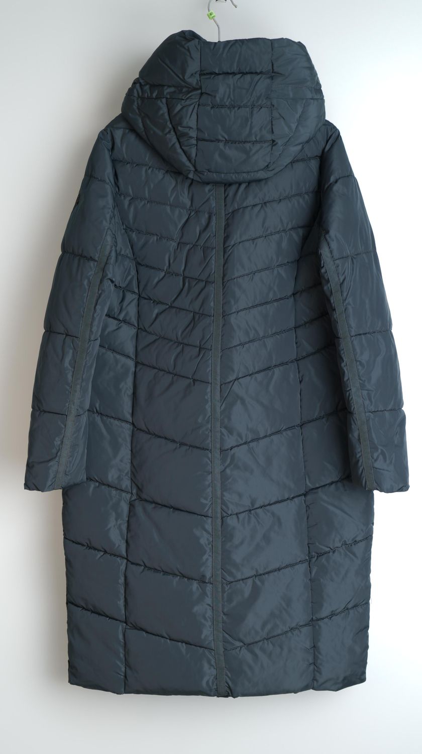 Kurtka zimowa, sięgająca za kolano, dobrze ocieplana, z kapturem ( z taśmą i stoperami do ściągnięcia ). Zapinana na dwukierunkowy suwak . Kieszenie z przodu po ukosie odszyte plisą i zapinane na napy. Po bokach rozporki, zapinane na napy, wygodne np. w aucie. W rękawach dodatkowo wszyte 20 cm od końca dzianinowe rękawki wykończone ściągaczem, które chronią przed zimnem. Kurtka ładnie pikowana, zgrabna.